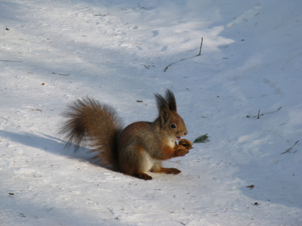 Белки в Павловском парке привыкли к людям и не боятся их. Выбегая на тропинки, они готовы принять любое Ваше угощение. Но, вместе с тем, они, в какой-то мере, и трусливы — стоит сделать неловкое движение, и зверек живо от Вас убежит.