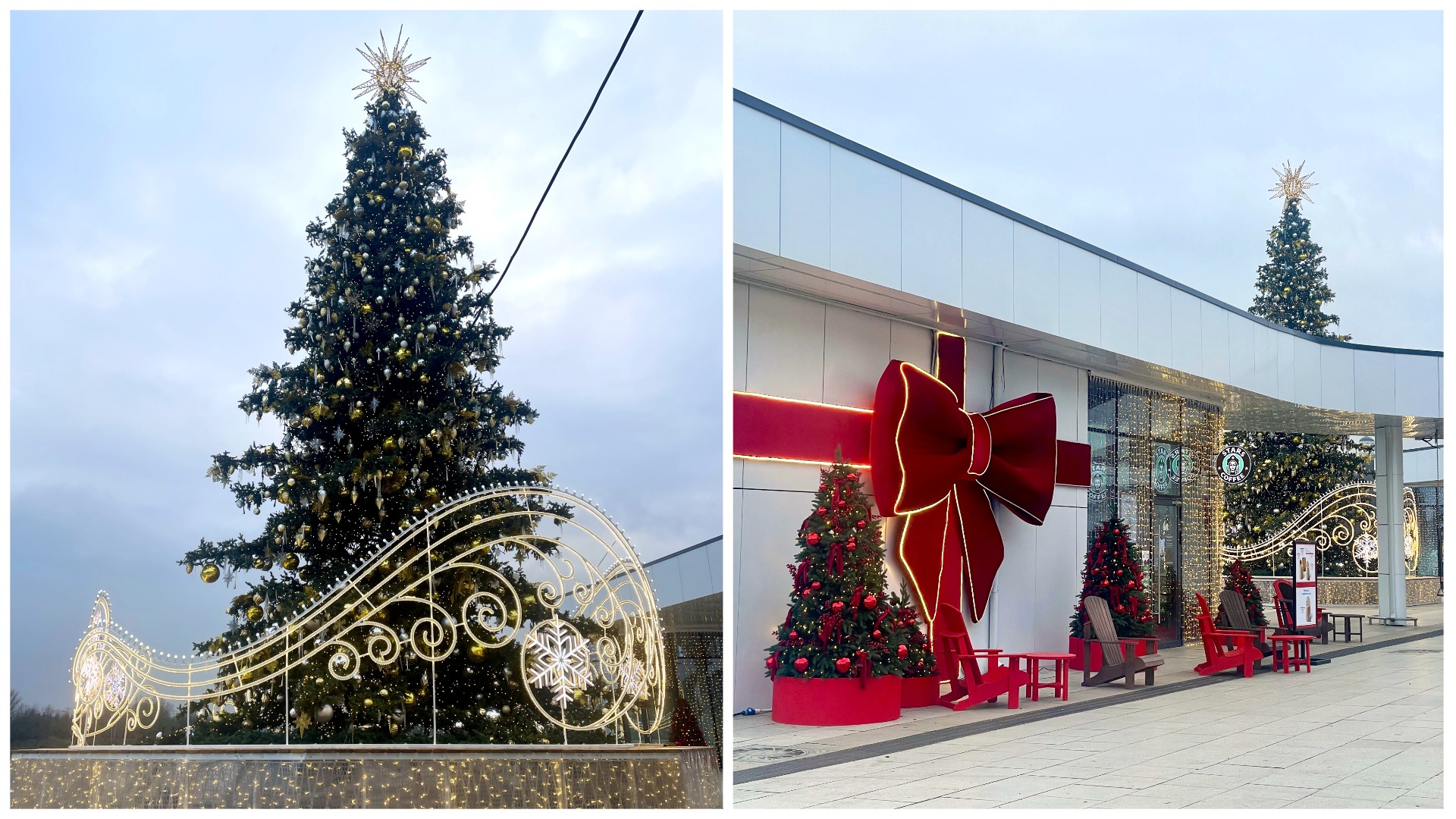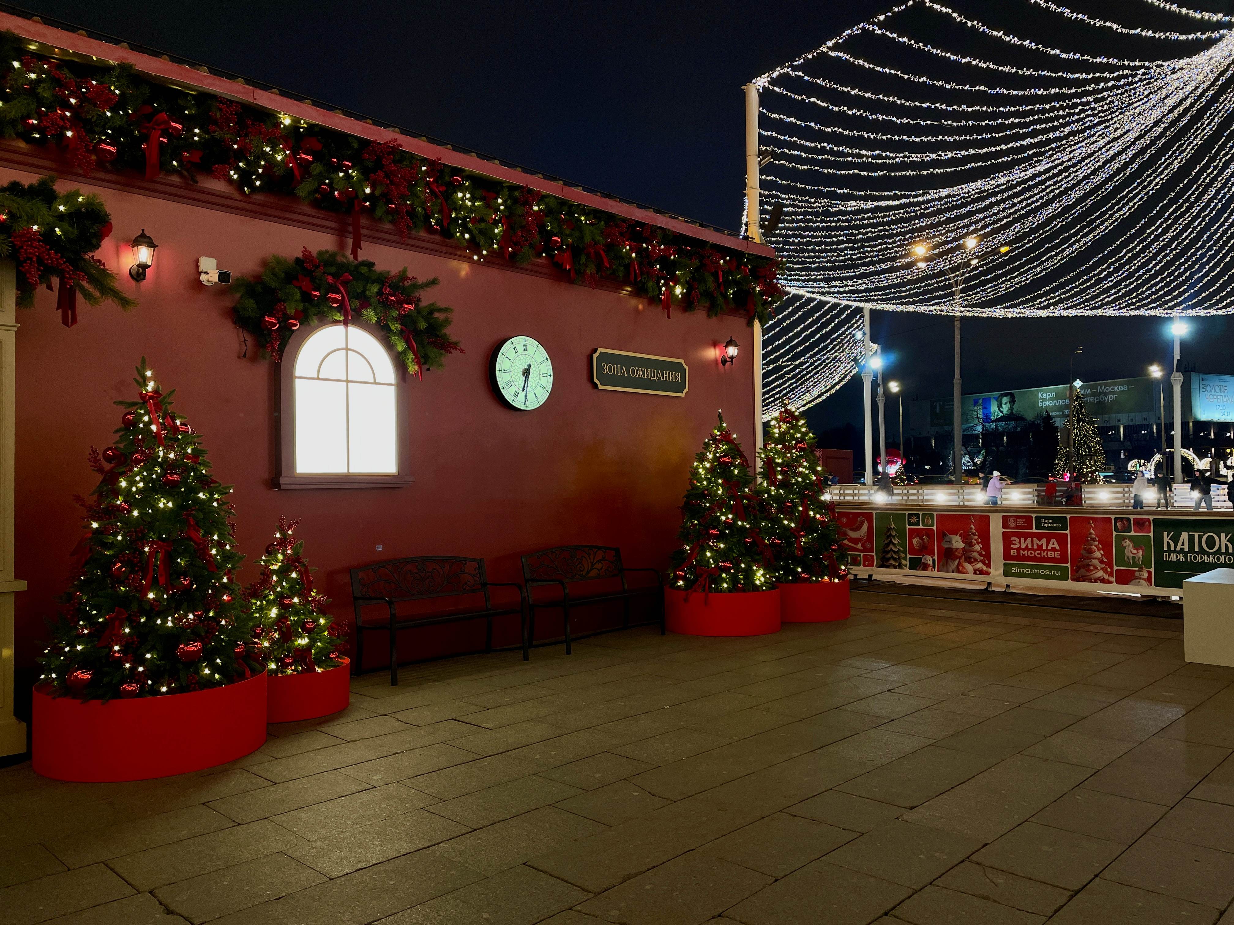 Пространство вокруг катка тоже оформлено празднично. Здесь можно увидеть крупные ёлочные шары, зимний арочный тоннель и несколько красочных фотозон. На Причальной площади обустроена лаунж‑зона, есть большая ёлка и декорированные павильоны.