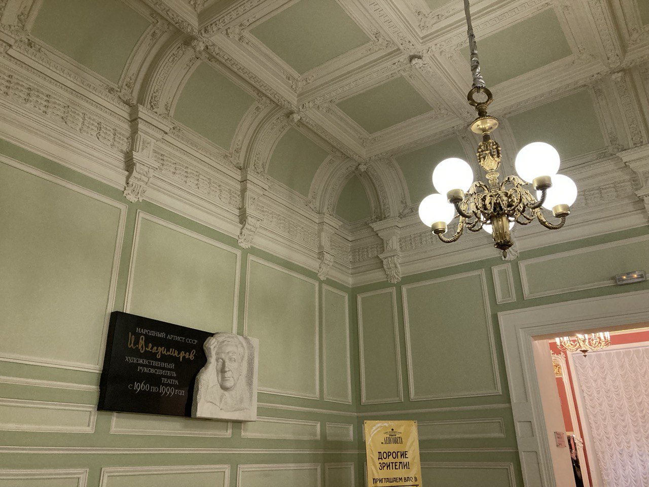 Далее парадная лестница приведёт вас на второй этаж. Здесь на себя обращают взгляд бело-салатовые стены и мемориальная доска в память о режиссере Игоре Владимирове, который руководил театром около 40 лет.