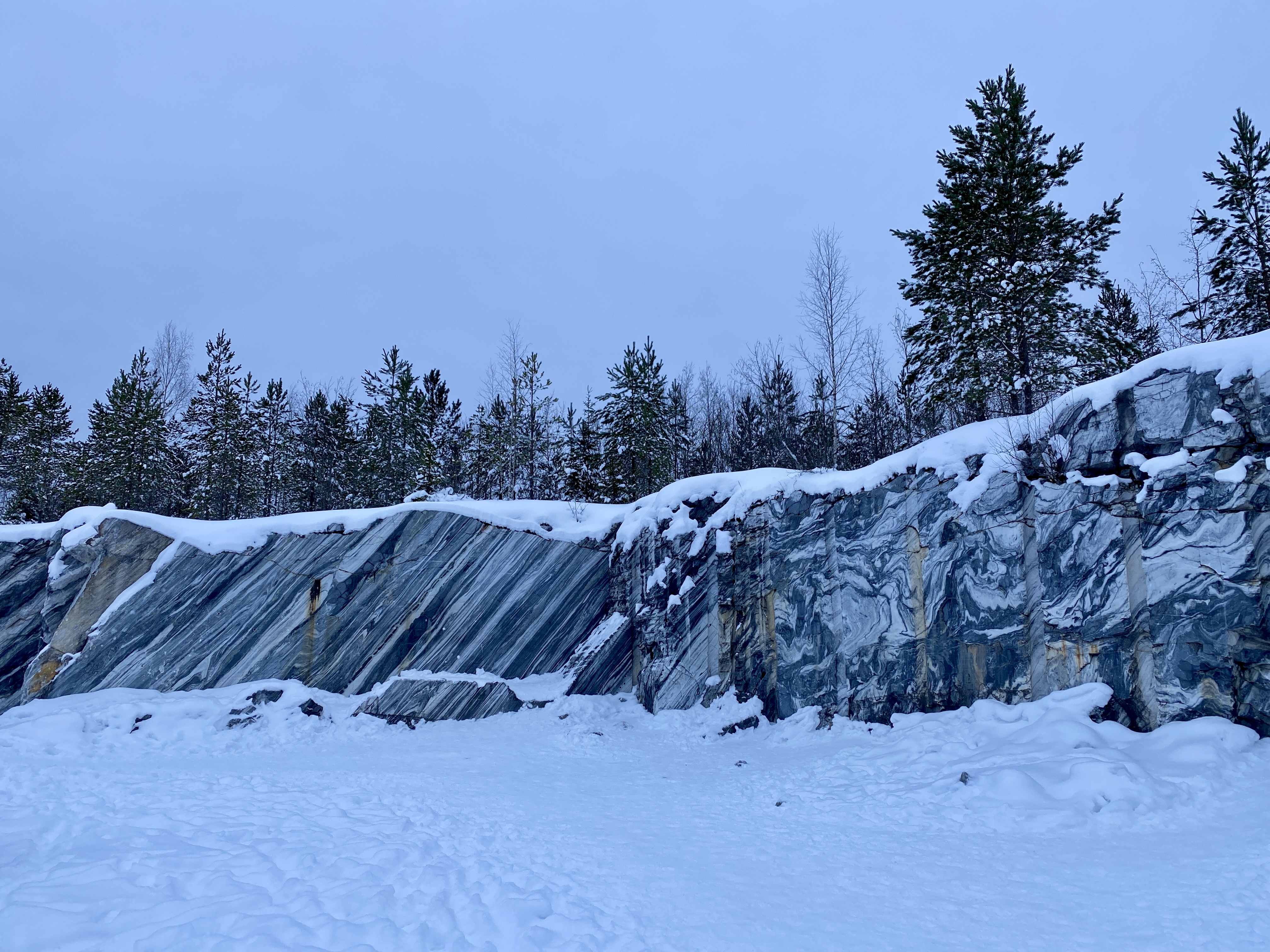 Карельский парк «Рускеала» — это квинтэссенция эстетичной зимы. Здесь можно стряхивать снег с сосновых веток, изучать узор мраморного каньона (который ещё и подсвечивают вечером), пить чай из термоса и гладить хаски. А ещё — прокатиться на единственном ретропоезде на паровозной тяге.