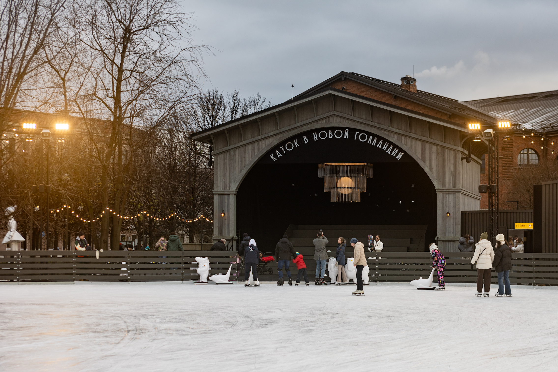 У соседей «Севкабеля» с зимними развлечениями тоже всё в порядке. Площадку Open Air Park превратили в 1500 м² зеркального льда. Каток дополнили лазерными установками: коньки и лёд переливаются разными цветами — выглядит очень эффектно в жизни и на фото!