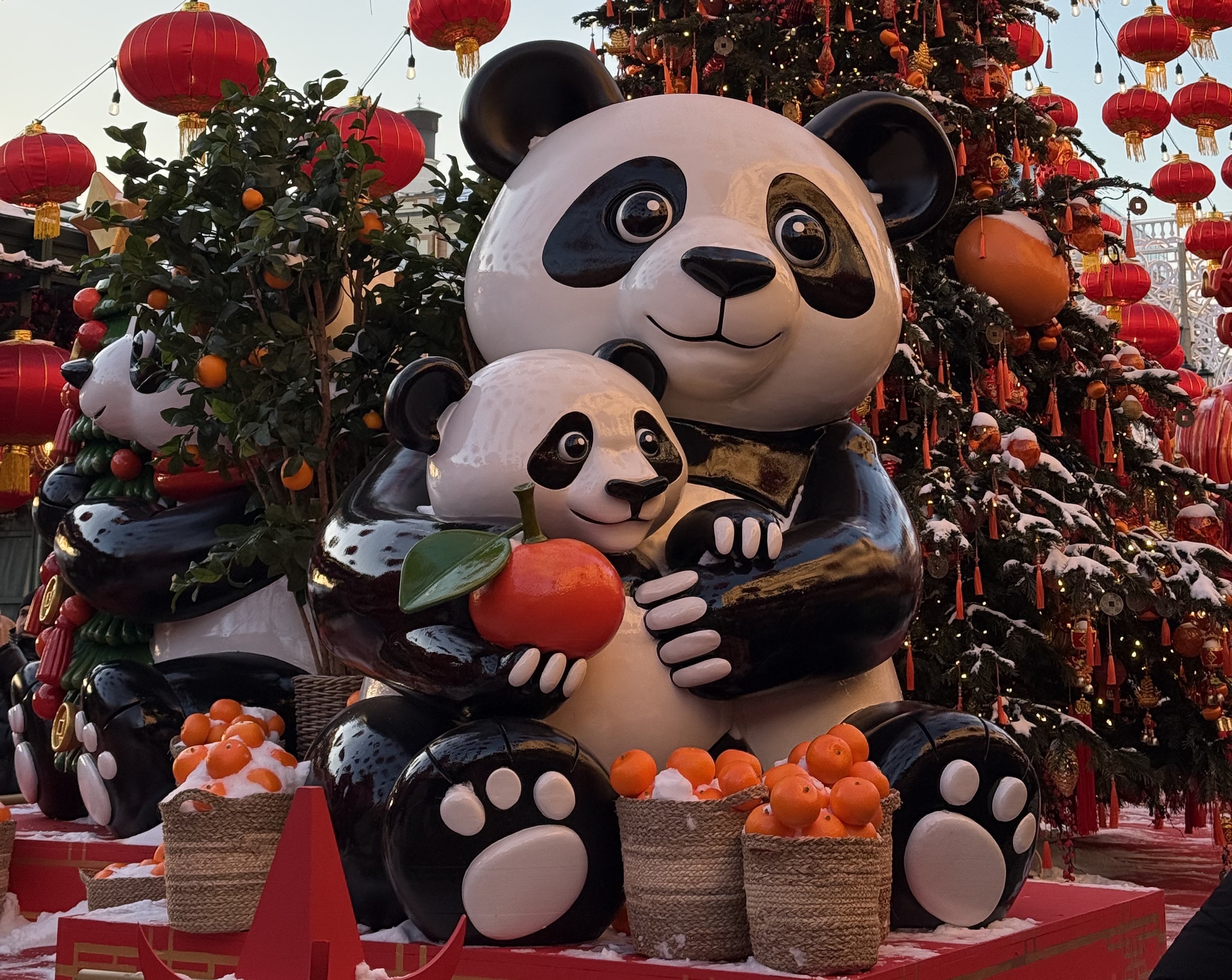 Ещё на площади гостей встречает красная огненная лошадь — символ 2026-го. Неподалёку поселились очаровательные панды с мандаринами.