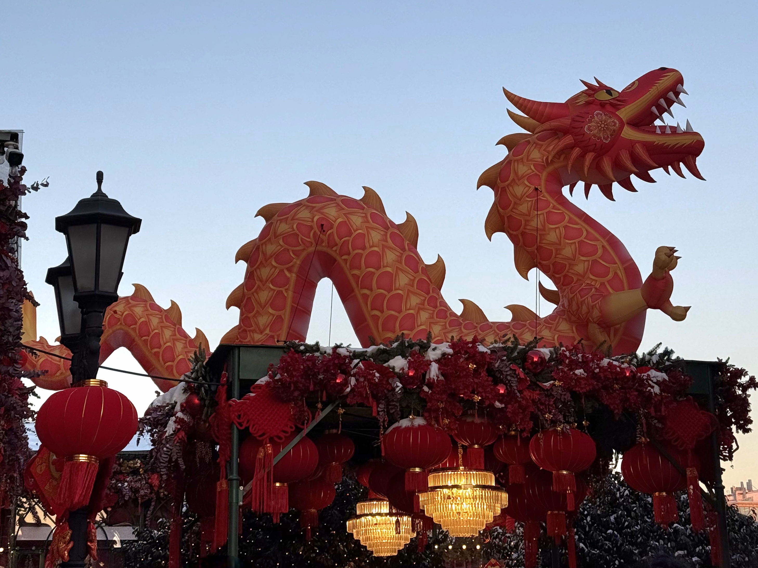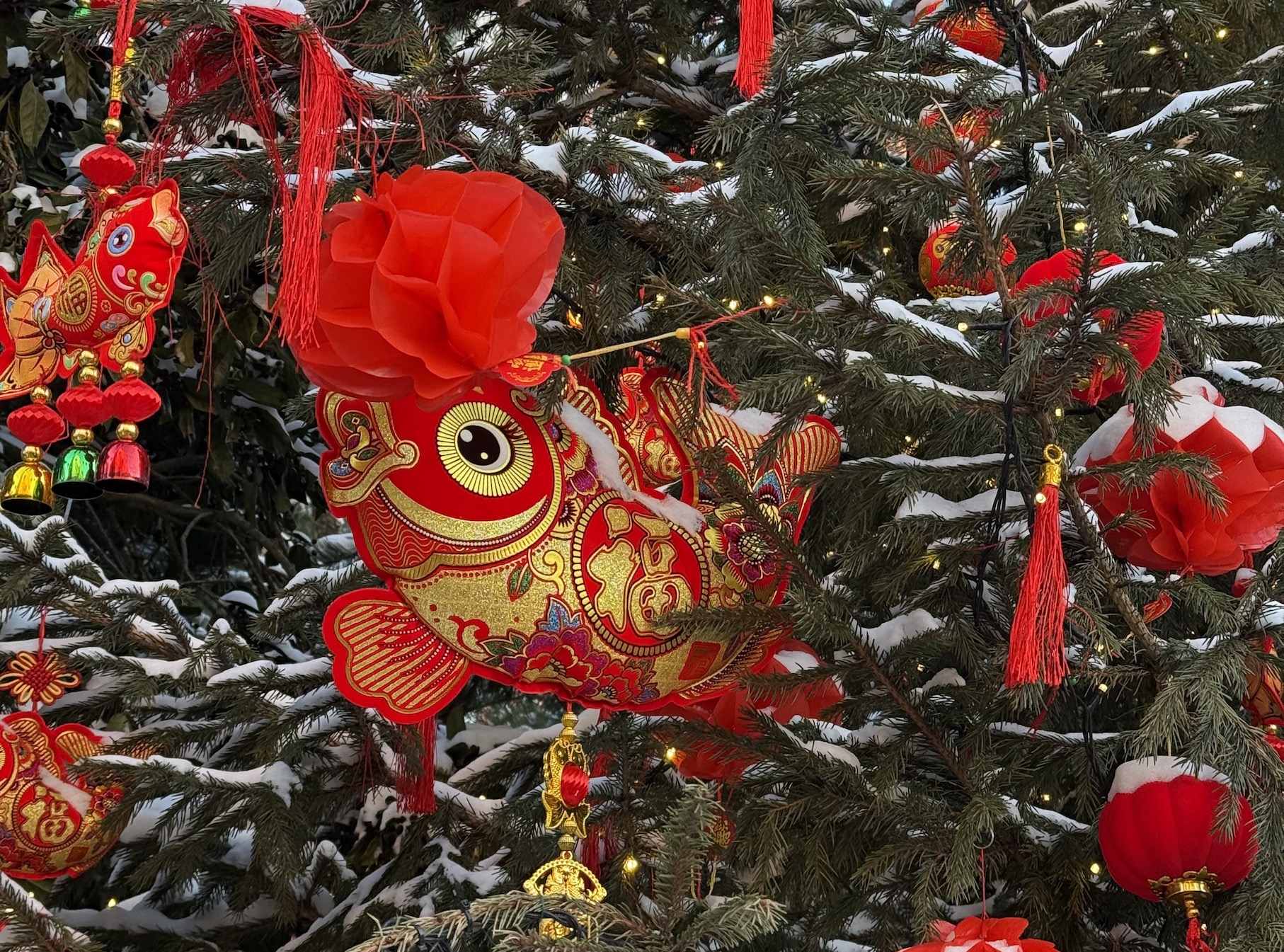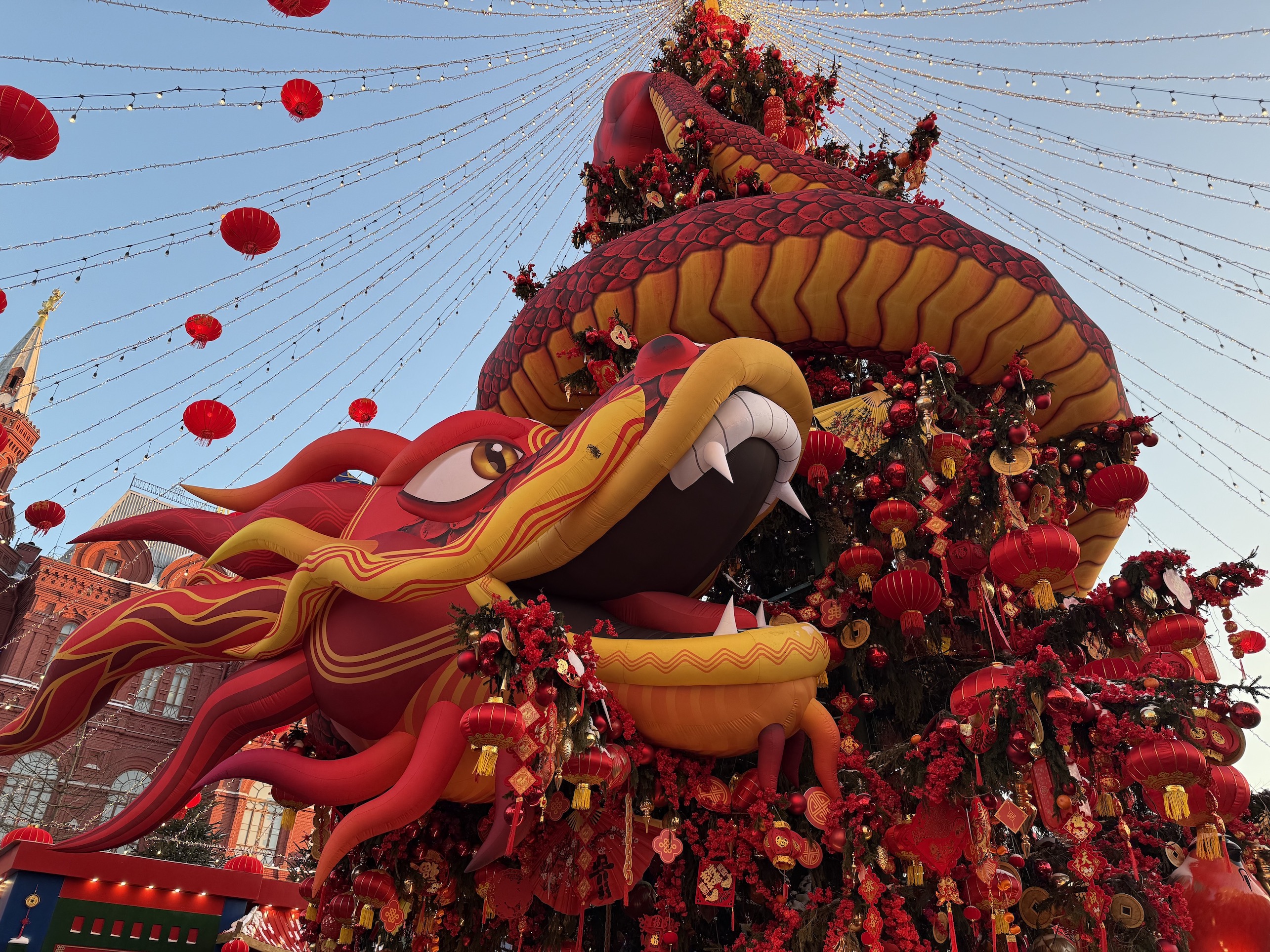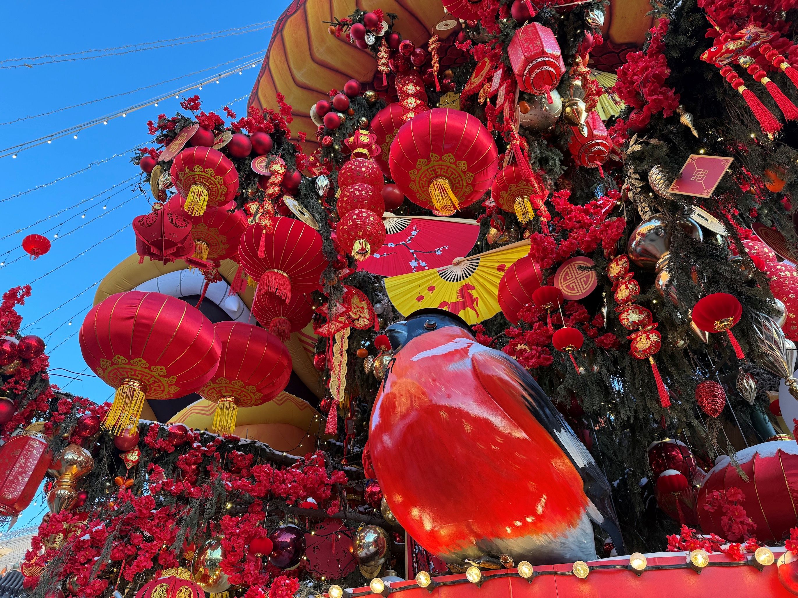 В центре площади установлена ёлка, которую обвивает огромный дракон. Приглядевшись, на праздничном дереве можно увидеть фонарики, подвески с кисточками, вееры, красные шары. От верхушки ёлки тянутся мерцающие гирлянды.