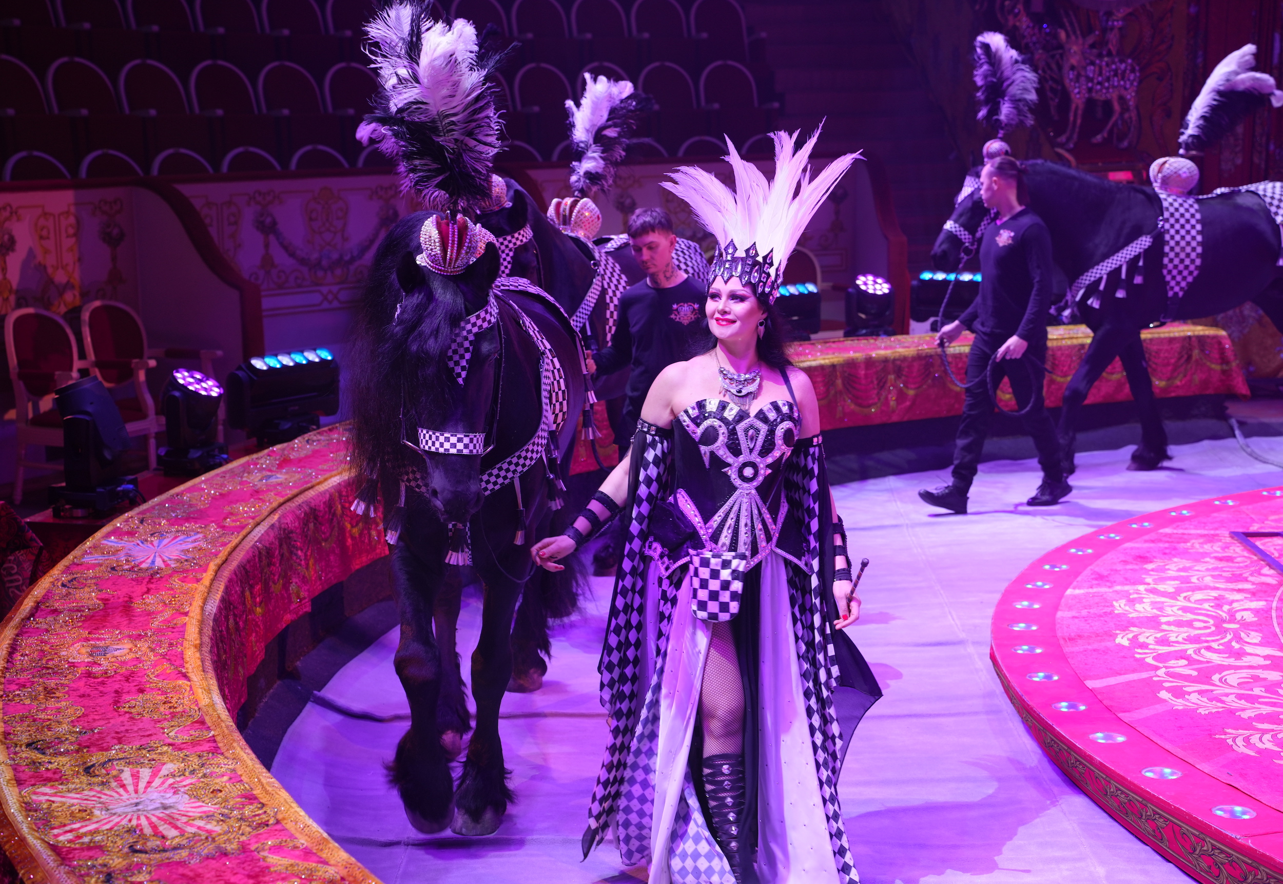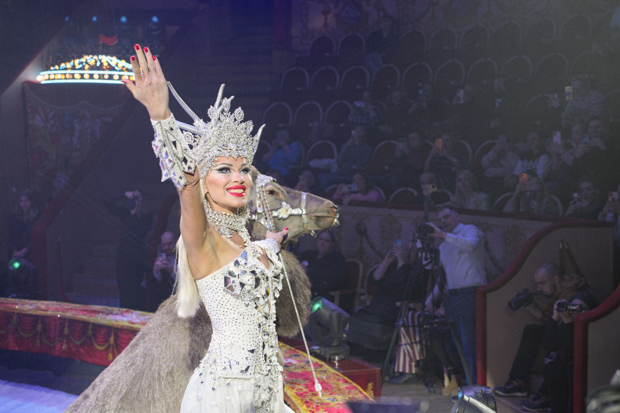 Для начала — вращающимся манежем, который позволяет всем зрителям, вне зависимости от их мест, разглядеть представление в деталях. На подиуме будут выступать не только артисты, но и животные.