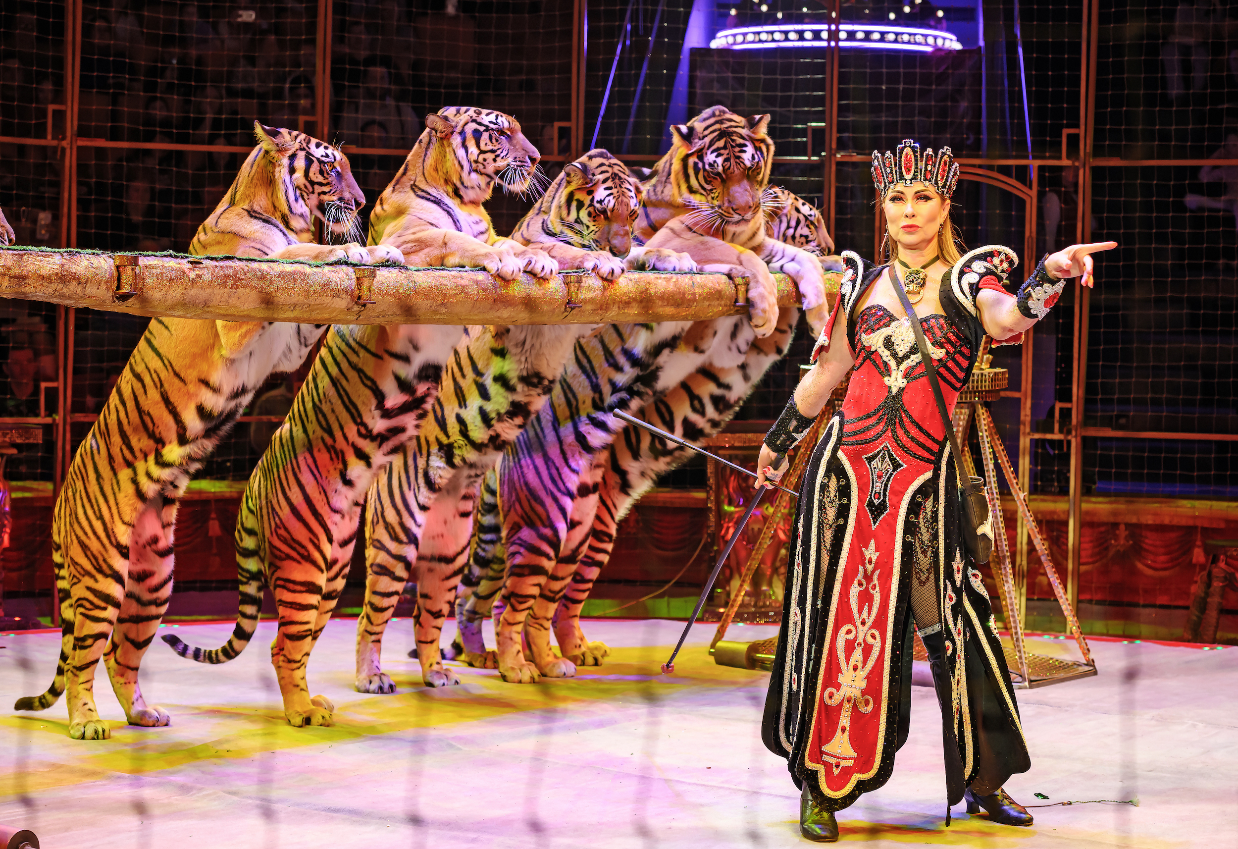 «Здесь будут фонтаны, и в фонтанах тигры будут вращаться на тубах. Это совершенно необычный реквизит, который специально придуман для заслуженной артистки России Людмилы Сурковой. Это единственная женщина в нашей стране, которая одна работает в клетке с 9 тиграми», — говорит Гия Эрадзе.