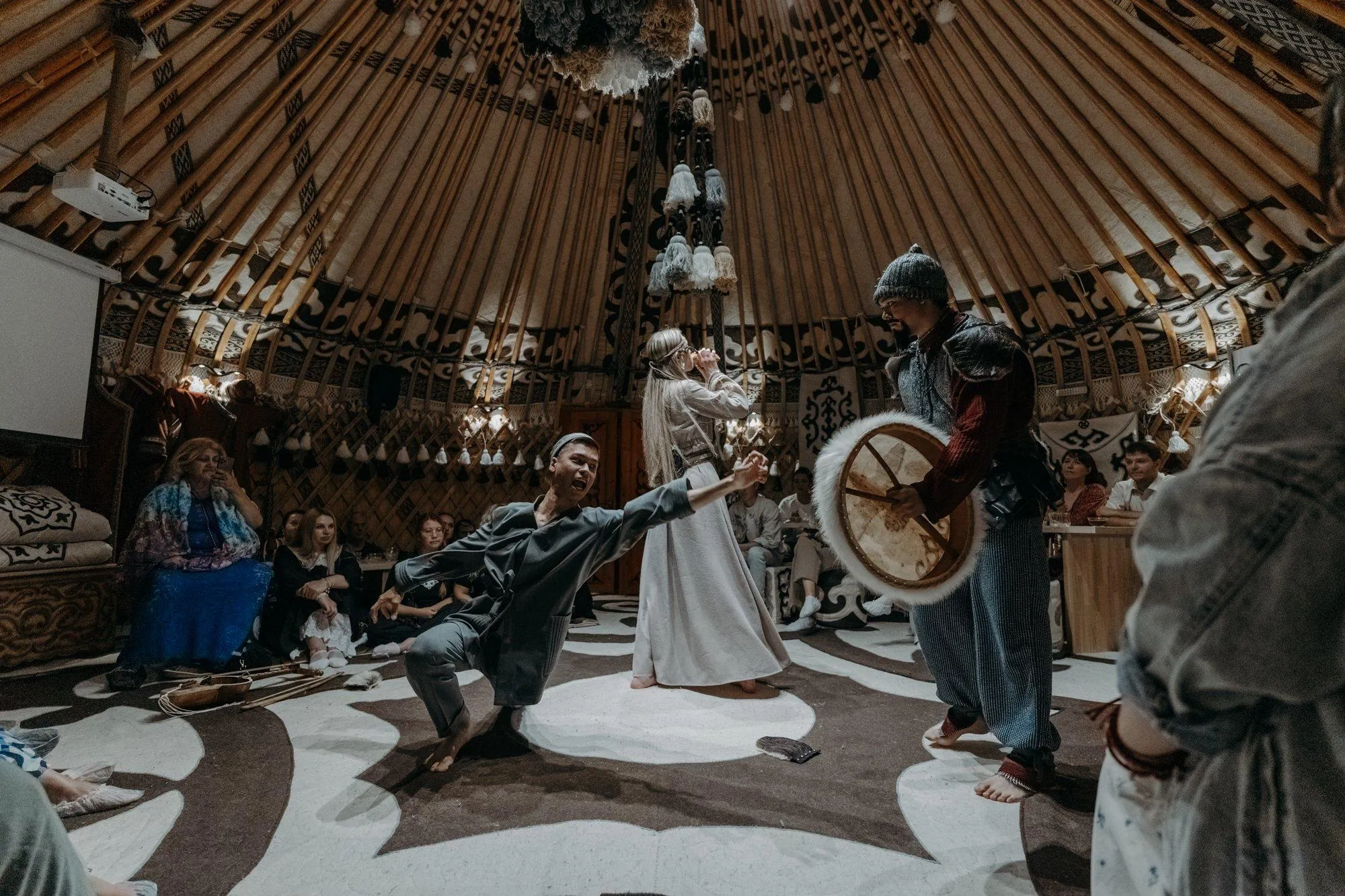 За порогом юрты вас ждёт путешествие сквозь века. Пространство окутает полумрак, а в воздухе будут витать ароматы татарского чая и звуки древних музыкальных инструментов — кубыза, таш‑сыбызгы, дингера и кыл‑кубыза.