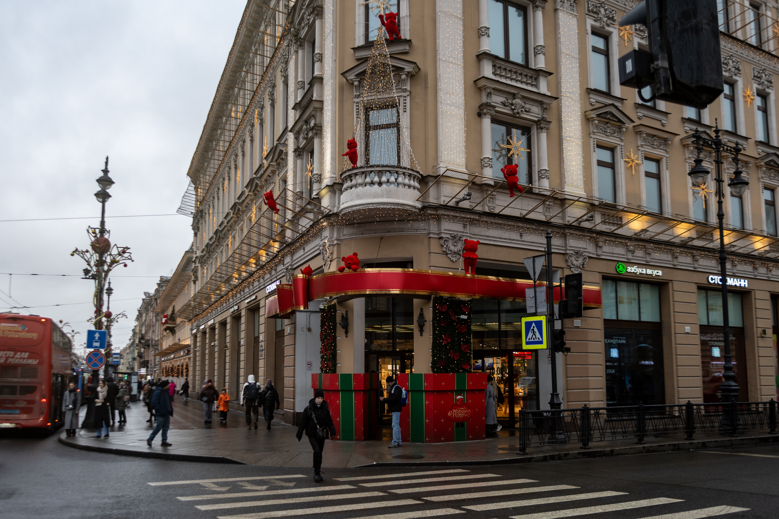 Возле станции «Гостиный двор», напротив «Пассажа», появилась огромная статуя Деда Мороза. В одной руке он держит ледяной посох, в другой — мешок с подарками. Рядом, на фасаде Думской башни, развесили гирлянды.