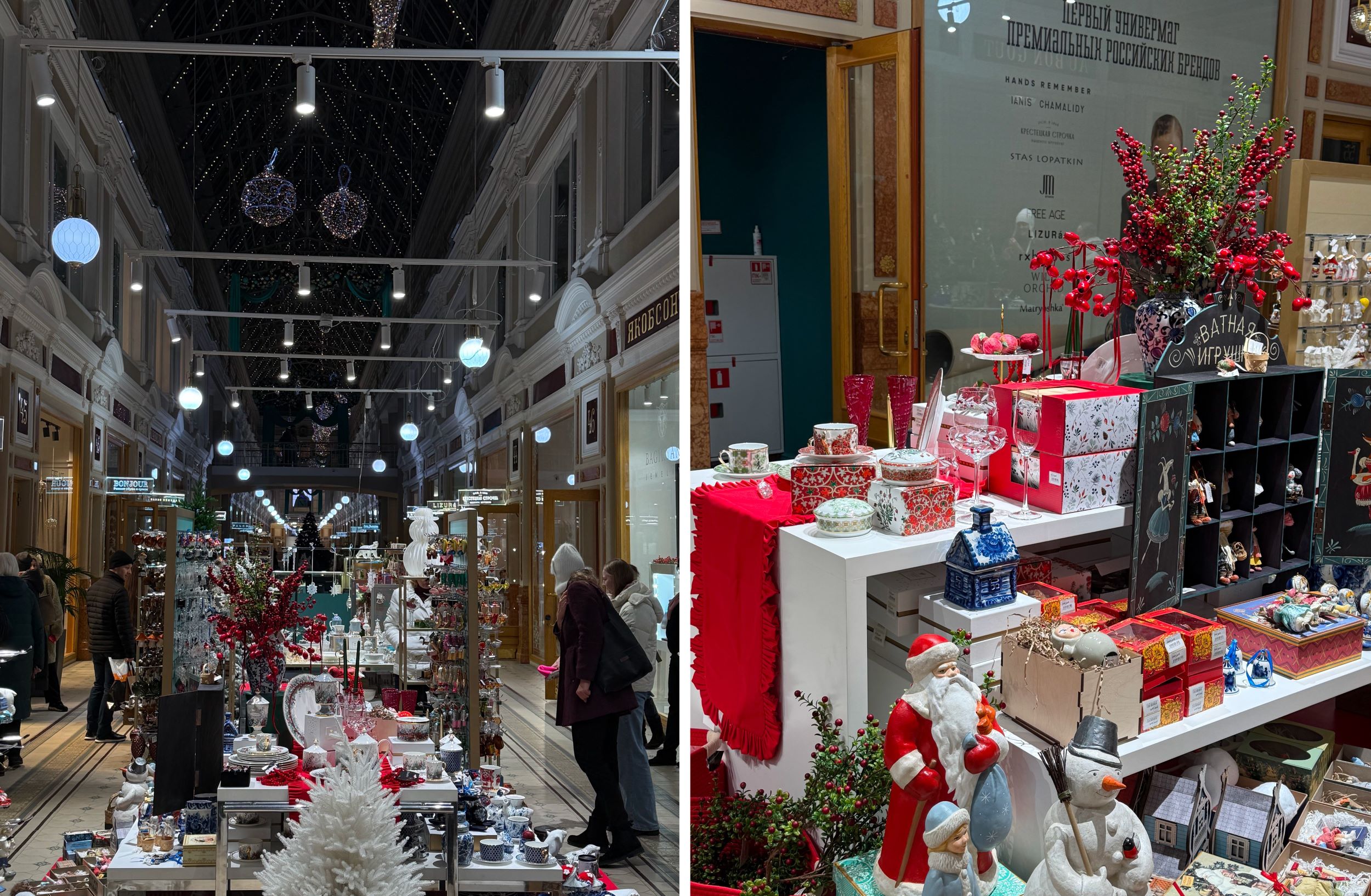 В центральном торговом доме украсили главную галерею. Под потолком повесили гирлянды — светящиеся и с хвойными ветками — а также подняли наверх огромные ёлочные игрушки. Внизу праздничную атмосферу создаёт ярмарка, где продаётся новогодний декор для дома: игрушки, ёлки, посуда и другие мелочи.