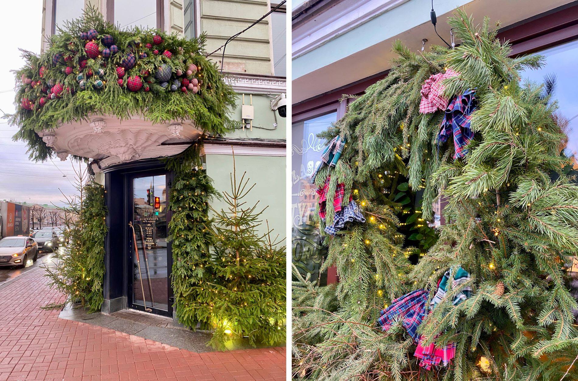 Праздничное оформление появилось и на входных группах ресторанов. Так, английский паб Blackchops украсили пышной хвойной гирляндой с игрушечными шарами в шотландскую клетку разных оттенков. Рядом — небольшая натуральная ель и венок с бантиками.