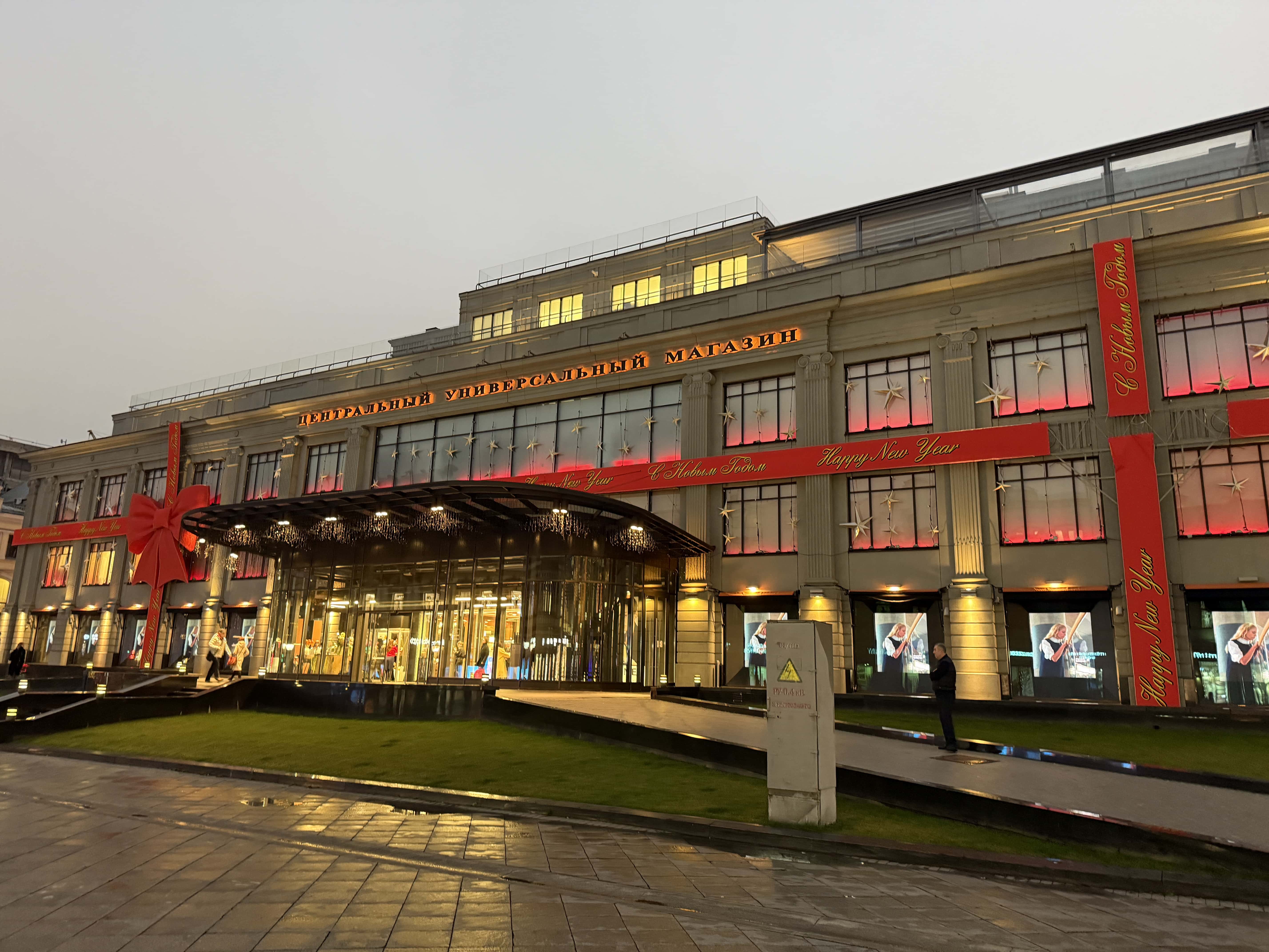 О праздничном декоре задумались и в ЦУМе. На фасаде разместили красные ленты с надписями «С Новым годом» и Happy New Year, большой бант и звёзды.