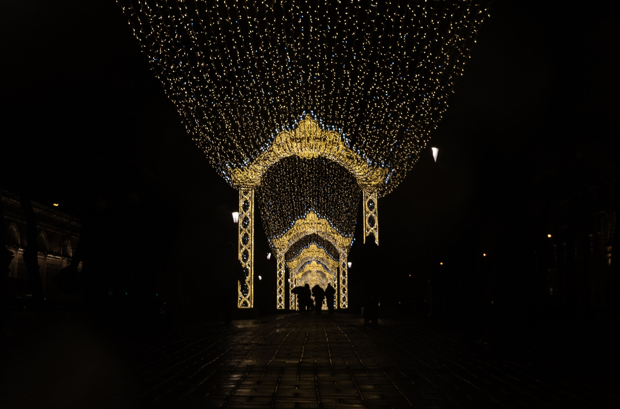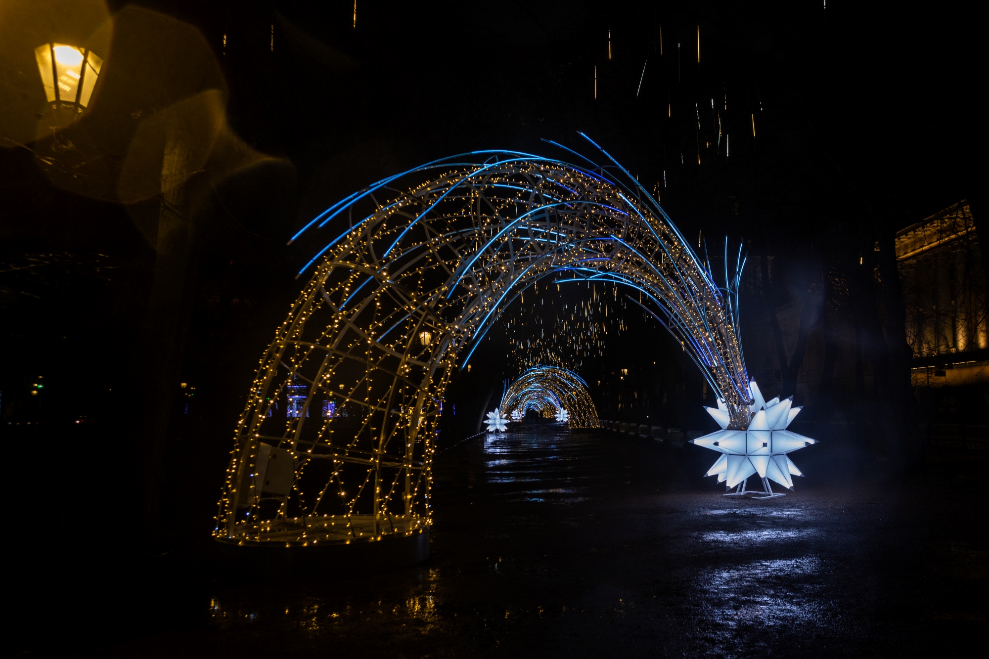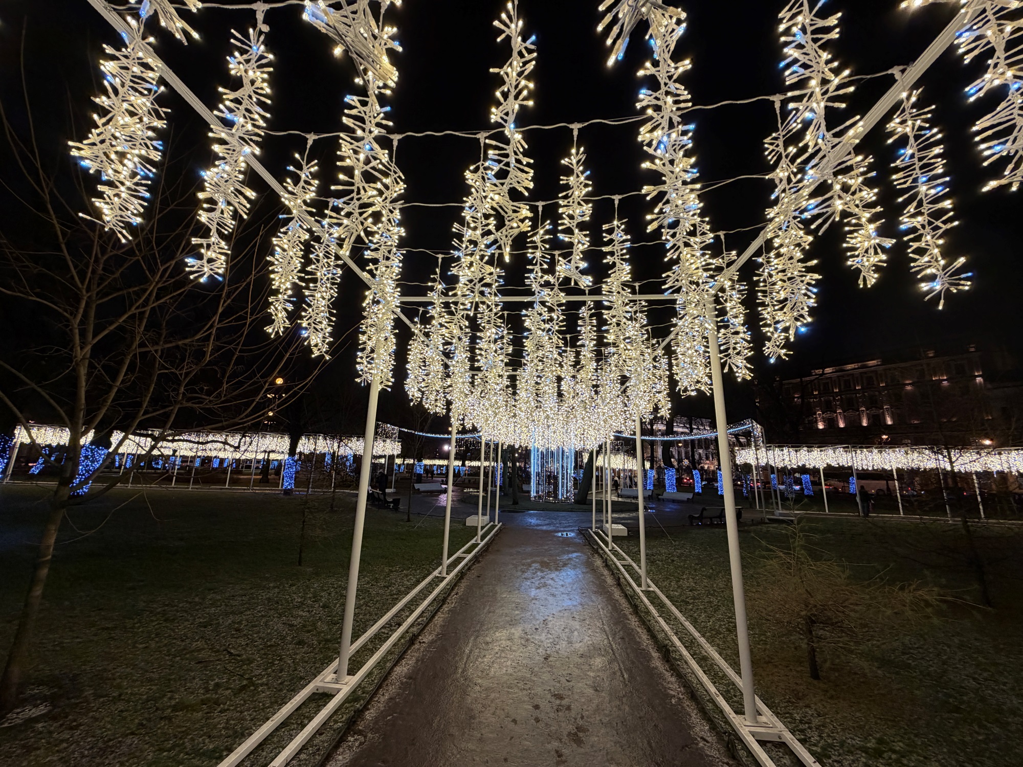 Конечно, в Москве тоже использовали прошлогодние украшения, например, гирлянду-балдахин, которая стала визитной карточкой ёлки на Манежной площади.