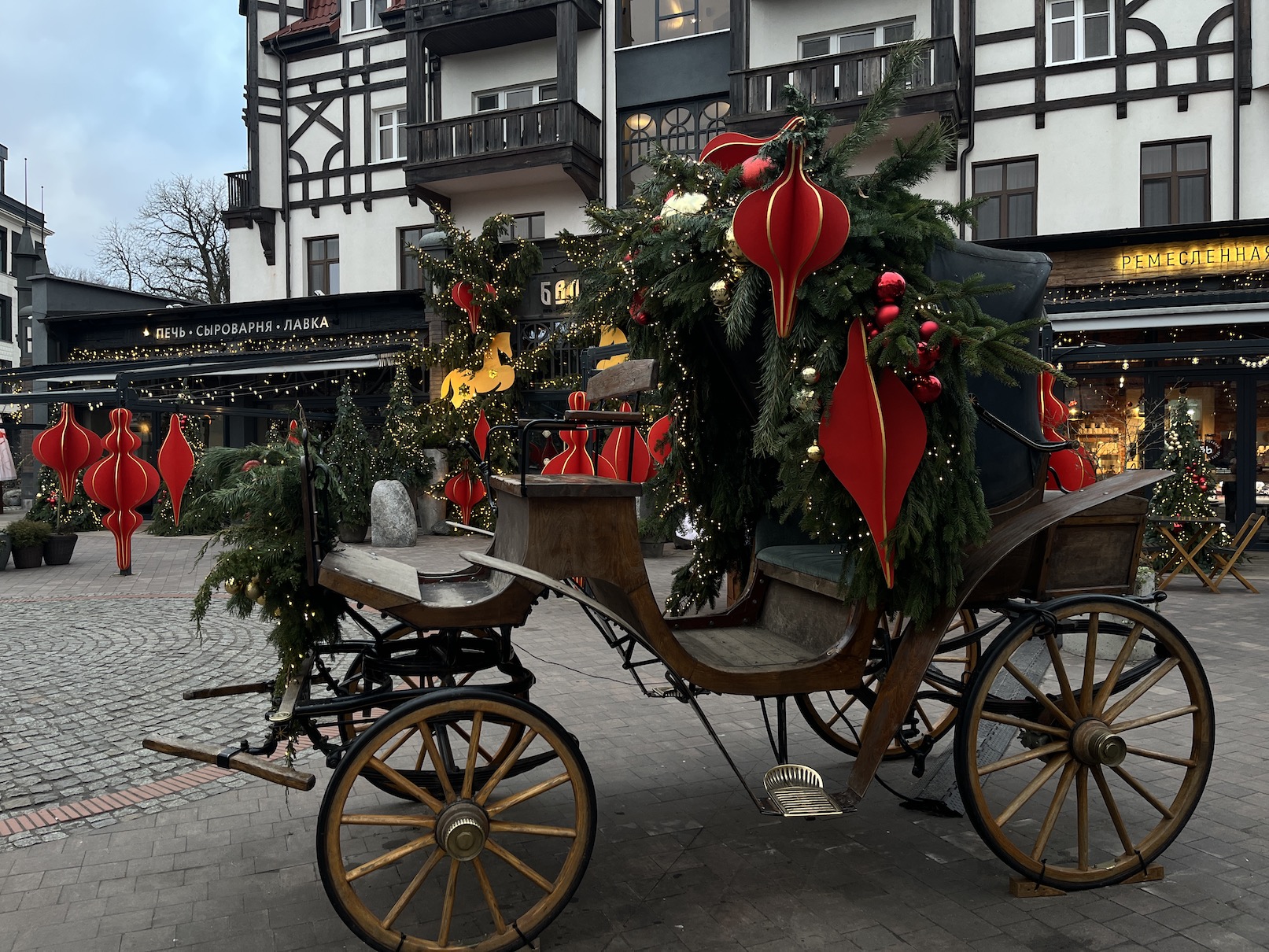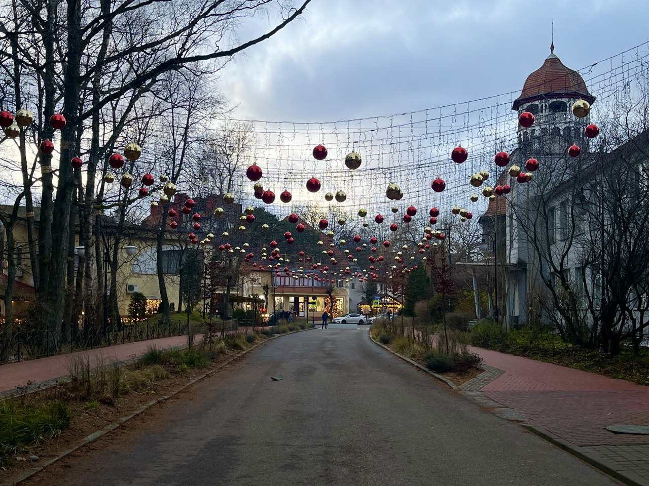 На Курортном проспекте по традиции горят самые яркие украшения. Например, у ресторана «Балт» поставили метровые елочные игрушки и праздничную колесницу, а входную арку украсили символами 2026 года.