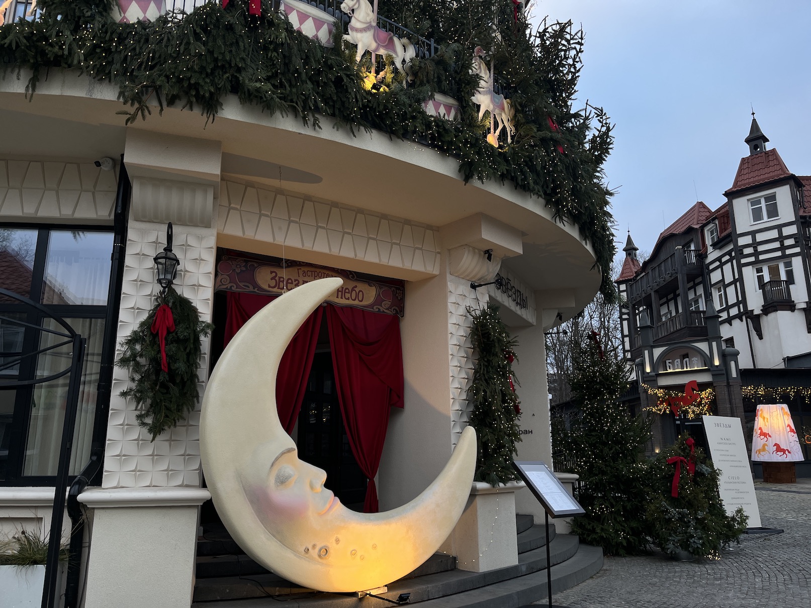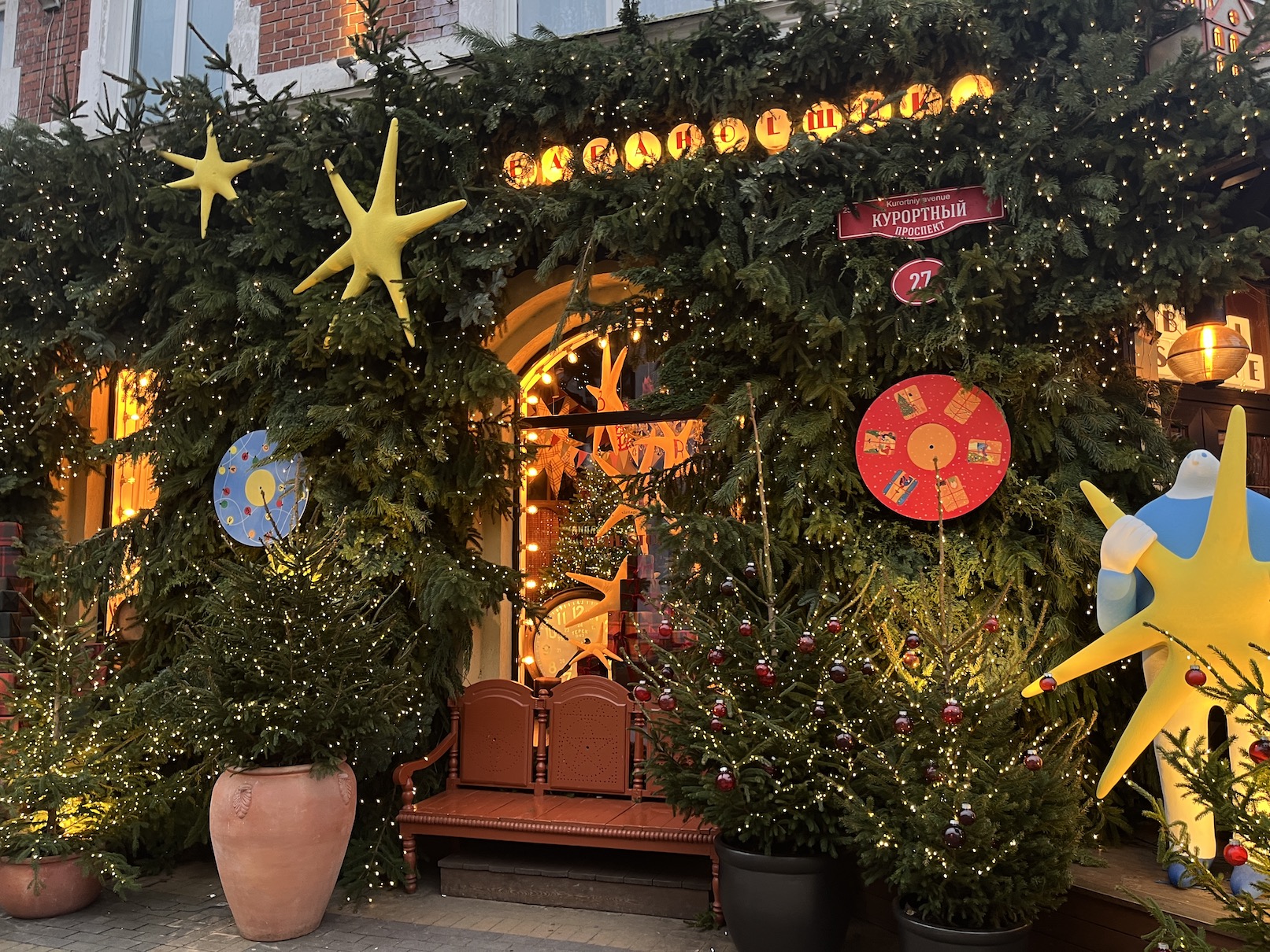 Торговый центр «Звёздное небо» декорирован гирляндой из еловых ветвей по всему фасаду, а у центрального входа установлена гигантская фигура месяца. Дальше по улице, на Курортном проспекте, 9, установлена масштабная хвойная инсталляция с зеркалом и «выбегающей» лошадью.
