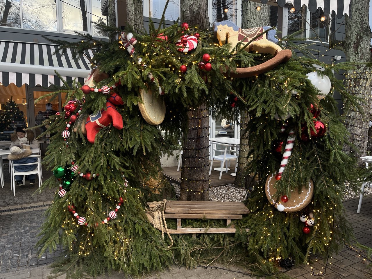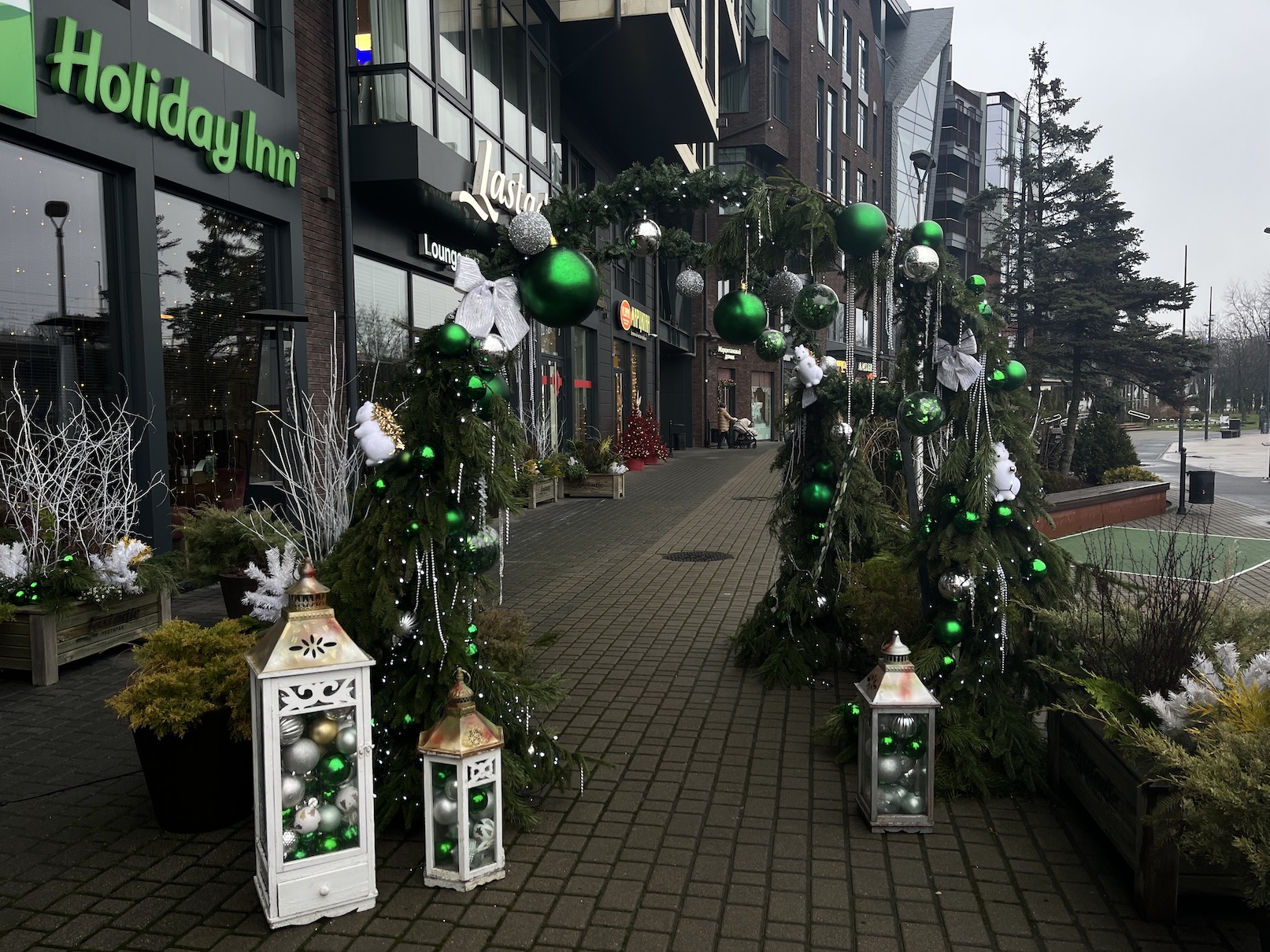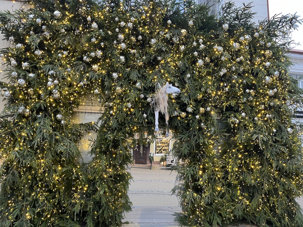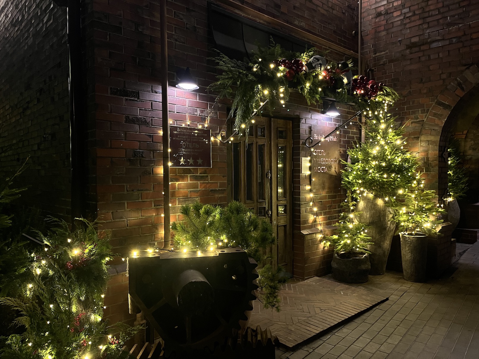 У гостиницы установили арку с хвойными ветвями, зелеными и серебристыми украшениями и белоснежными фонарями.