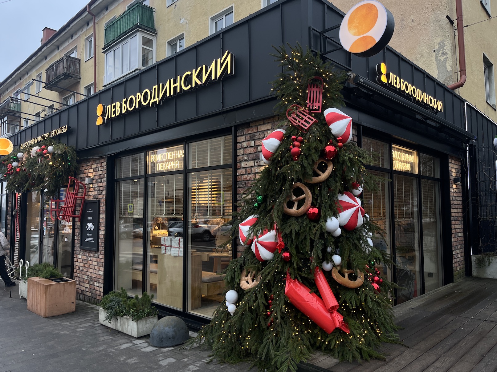 У пекарни «Лев Бородинский» можно увидеть декоративный хвойный венок с украшениями в виде лошадок-качалок, сахарных тросточек, пряников и, конечно, ёлочных шаров.