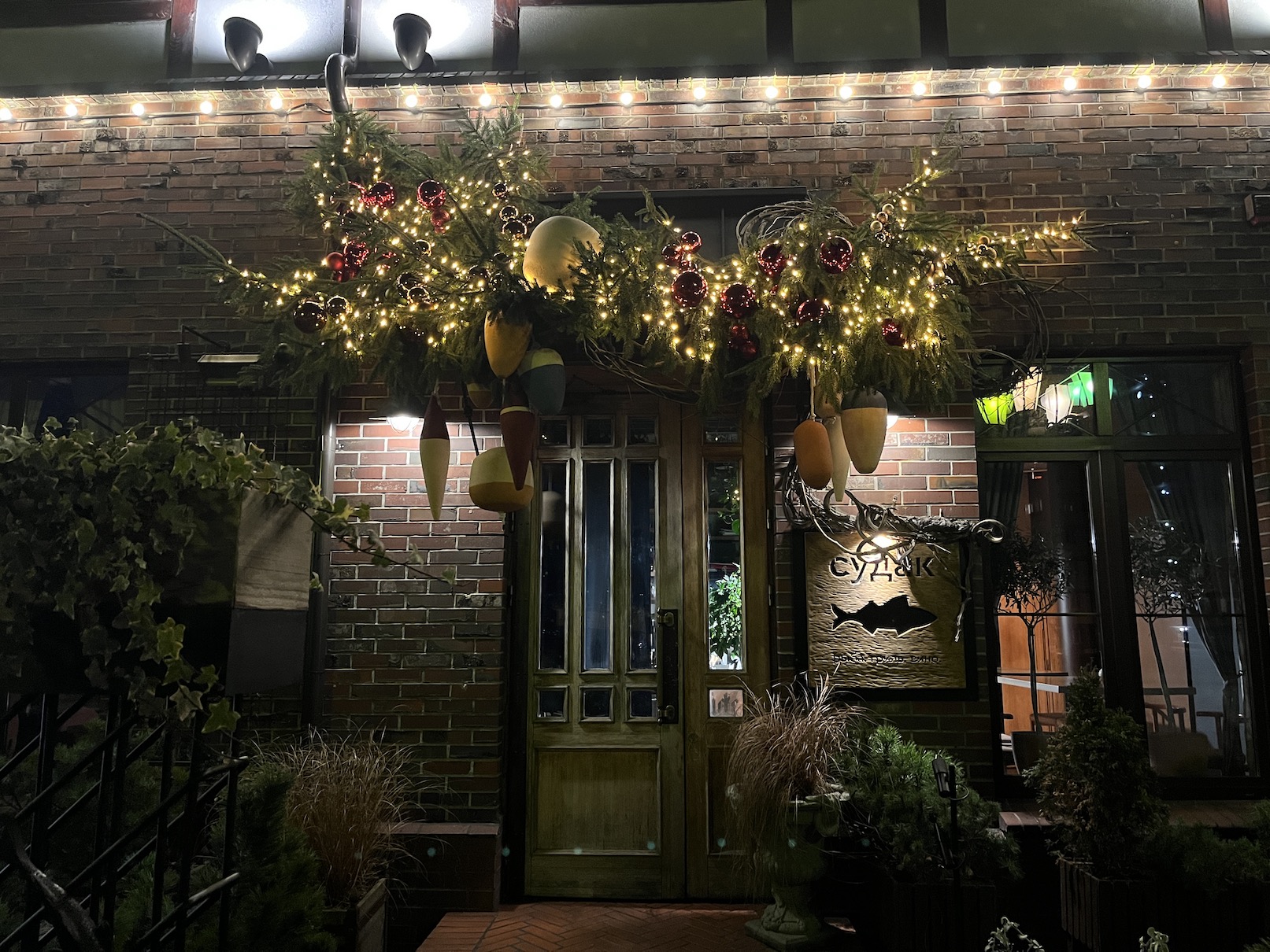 Над входом в ресторан повесили хвойную композицию с поплавками-игрушками и искрящейся гирляндой.