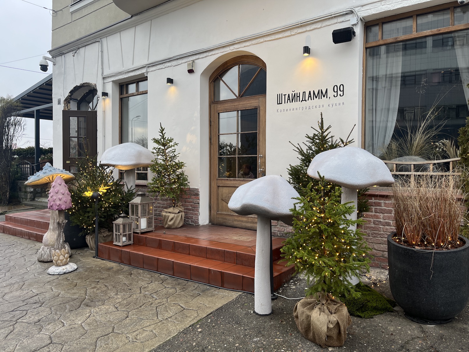 Декор ресторана создает ощущение уютной сказки. Центральный акцент — необычные декоративные грибы, которые «растут» в окружении молодых елей в мешковине.