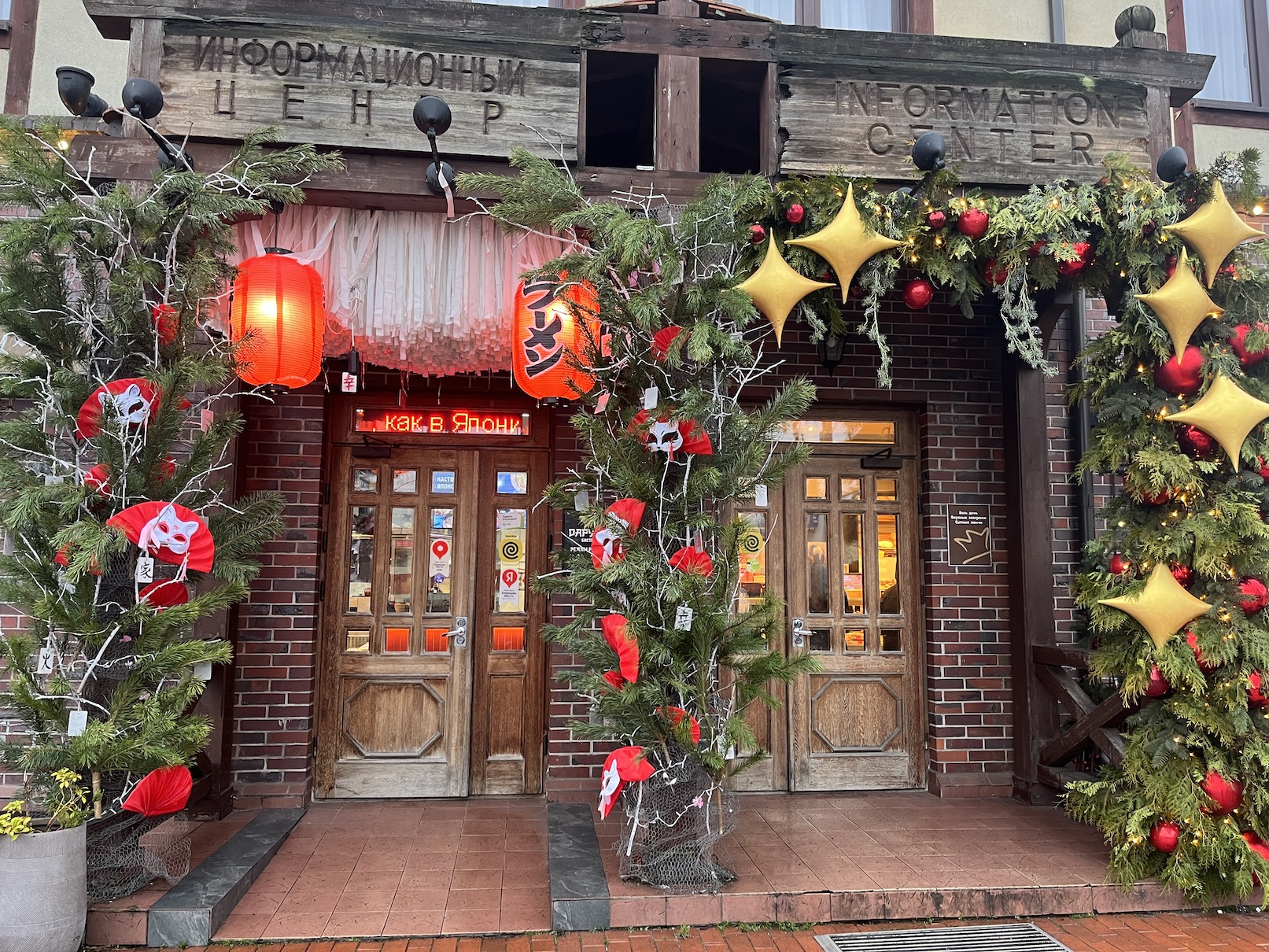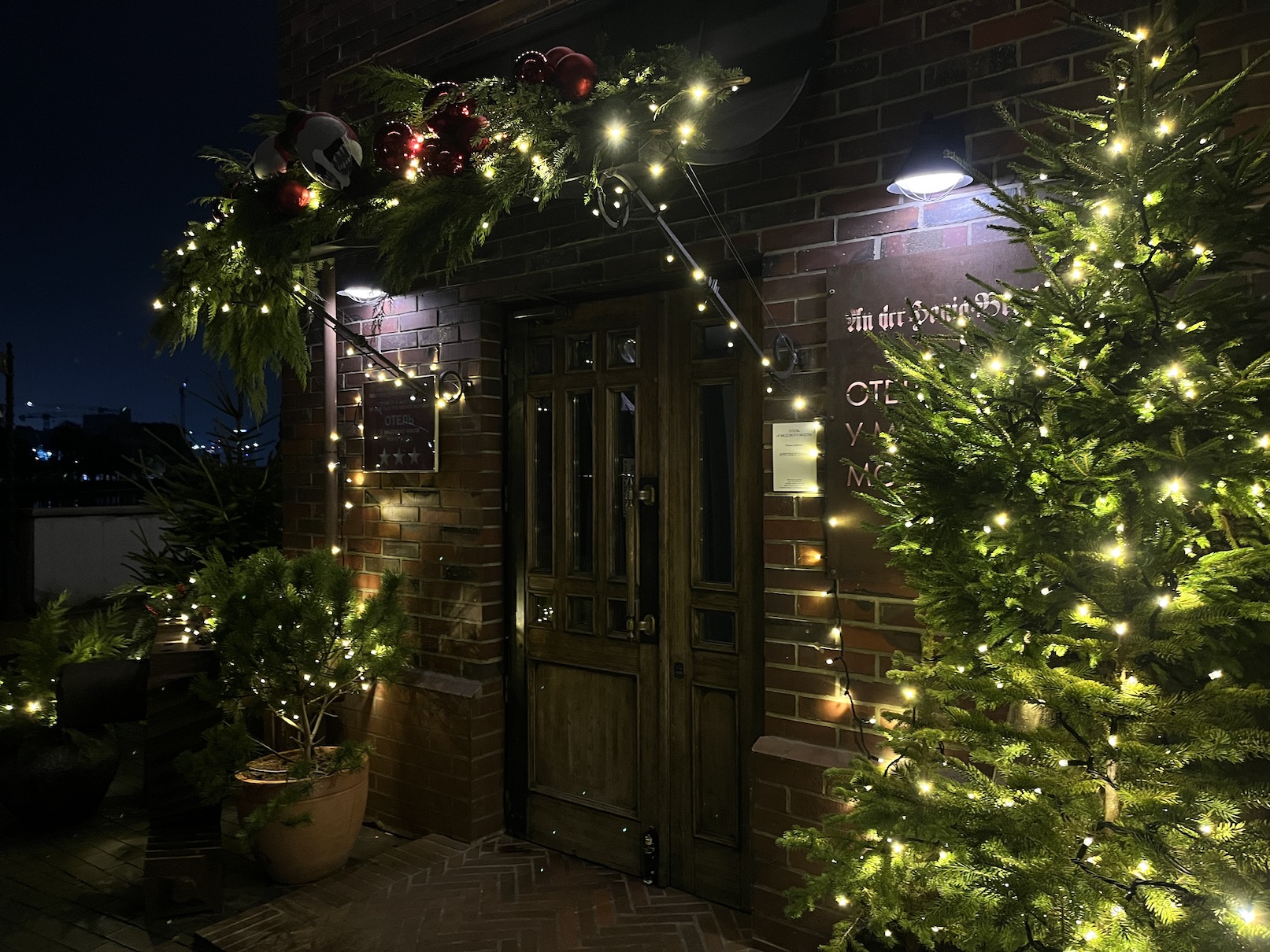 Отель декорирован живыми деревцами, которые обвиты гирляндами. А над входной дверью повесили алые елочные игрушки.