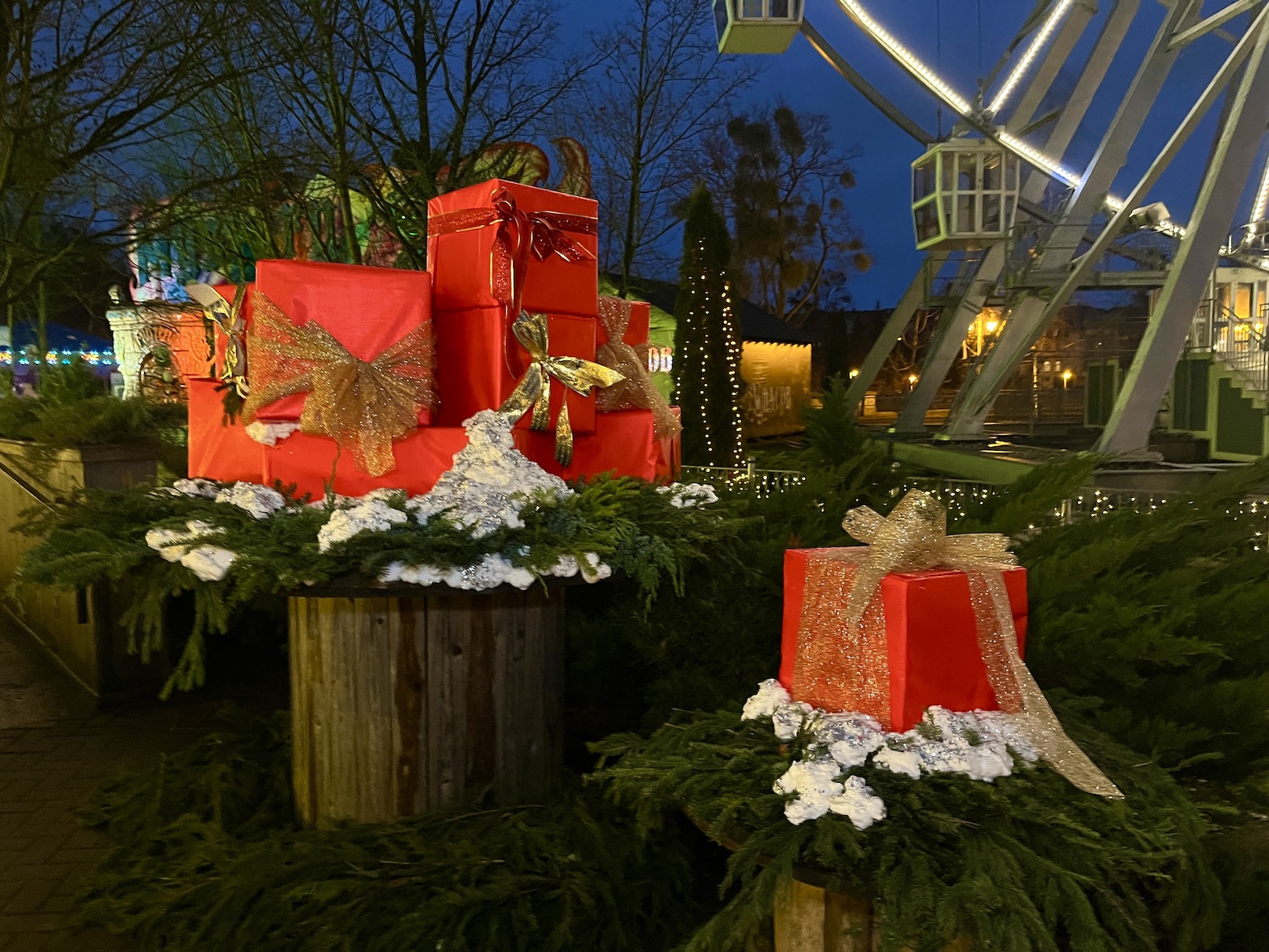 Пышный декор с несколькими фотозонами. Первая — упакованные подарки с золотыми акцентными бантами, окружённые еловыми ветвями и искусственными снегом. Вторая — украшенные деревья, у подножия которых расположились фигурки гномов в забавных красных шапочках.