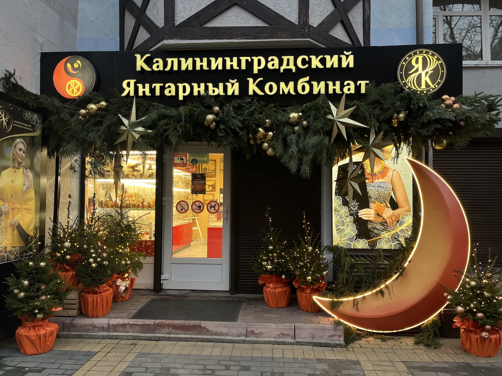 У магазина «Калининградский янтарный комбинат» декорации выдержаны в оранжево-жёлтых тонах, отсылающих к украшениям из солнечного камня. Магазин по соседству Amber Art оформил вход в тех же цветах, но с добавлением синих акцентов.