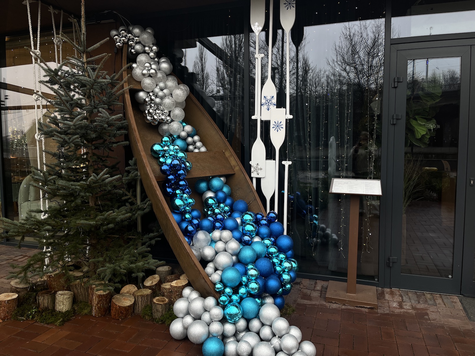 Водную тему рыбного ресторана поддерживает праздничная инсталляция с лодкой и пышным каскадом ёлочных шаров серебристого и бирюзово-синего оттенков на входе.