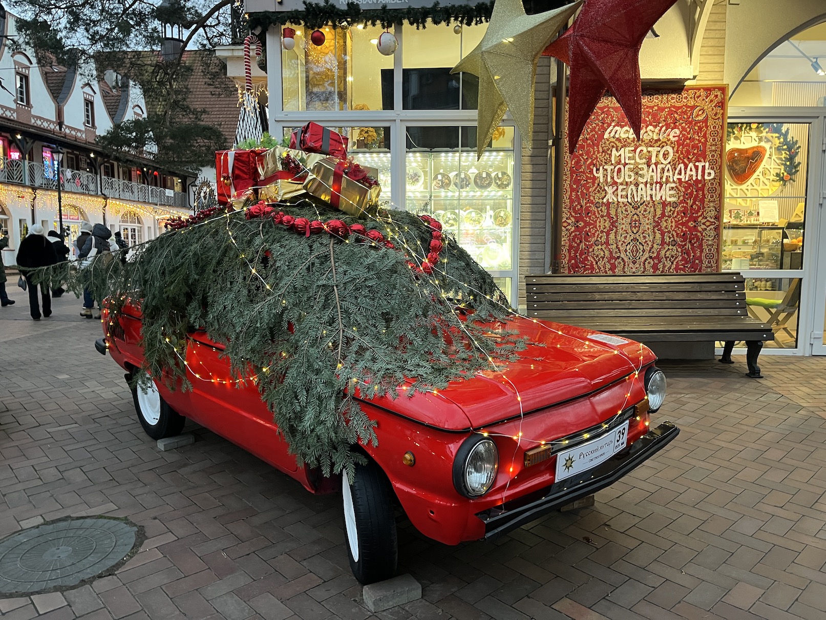 Рядом со входом в магазин «Русский янтарь» на улице Ленина, 15 установлена яркая фотозона с красной машиной, везущей подарки к празднику.