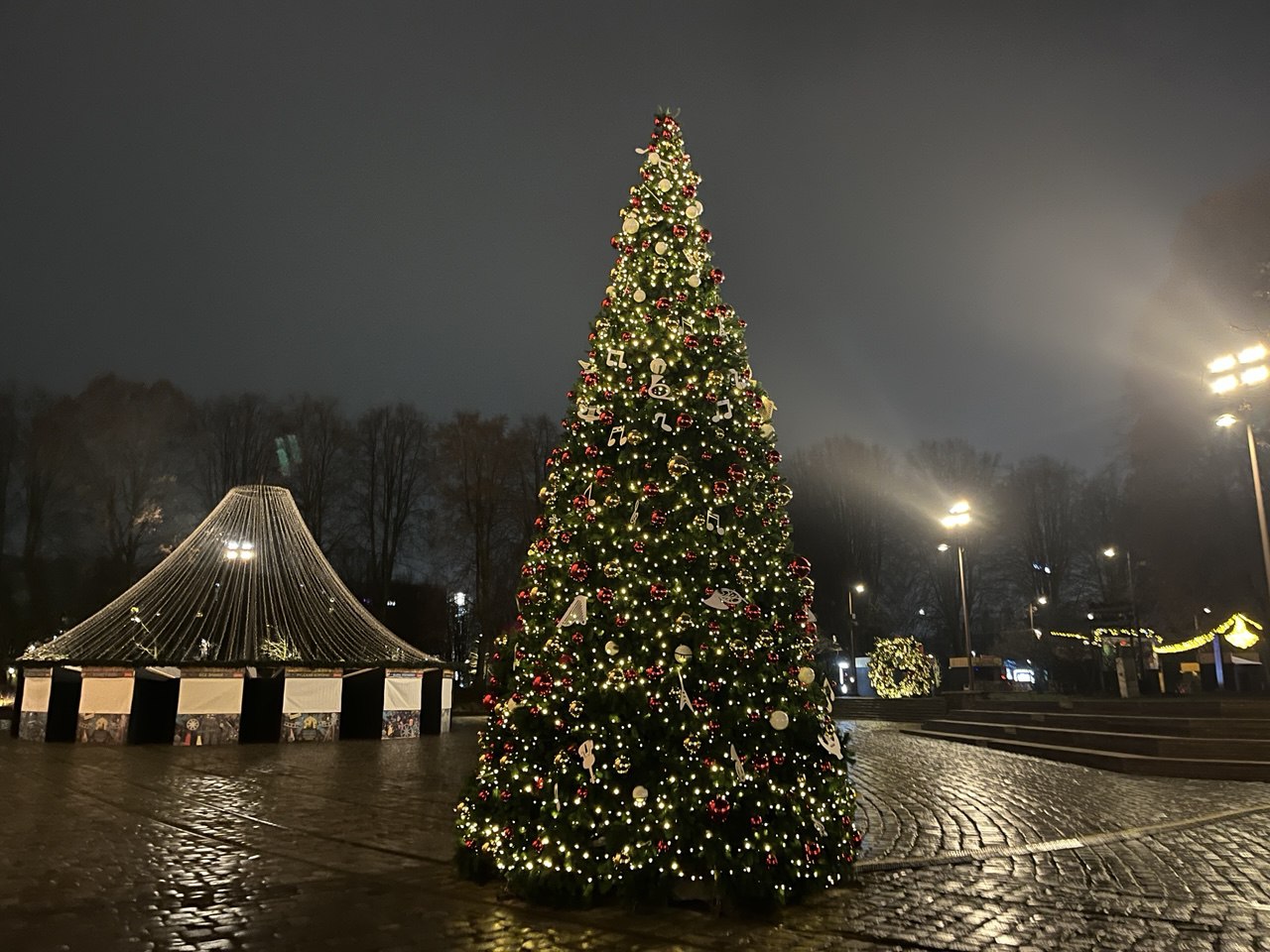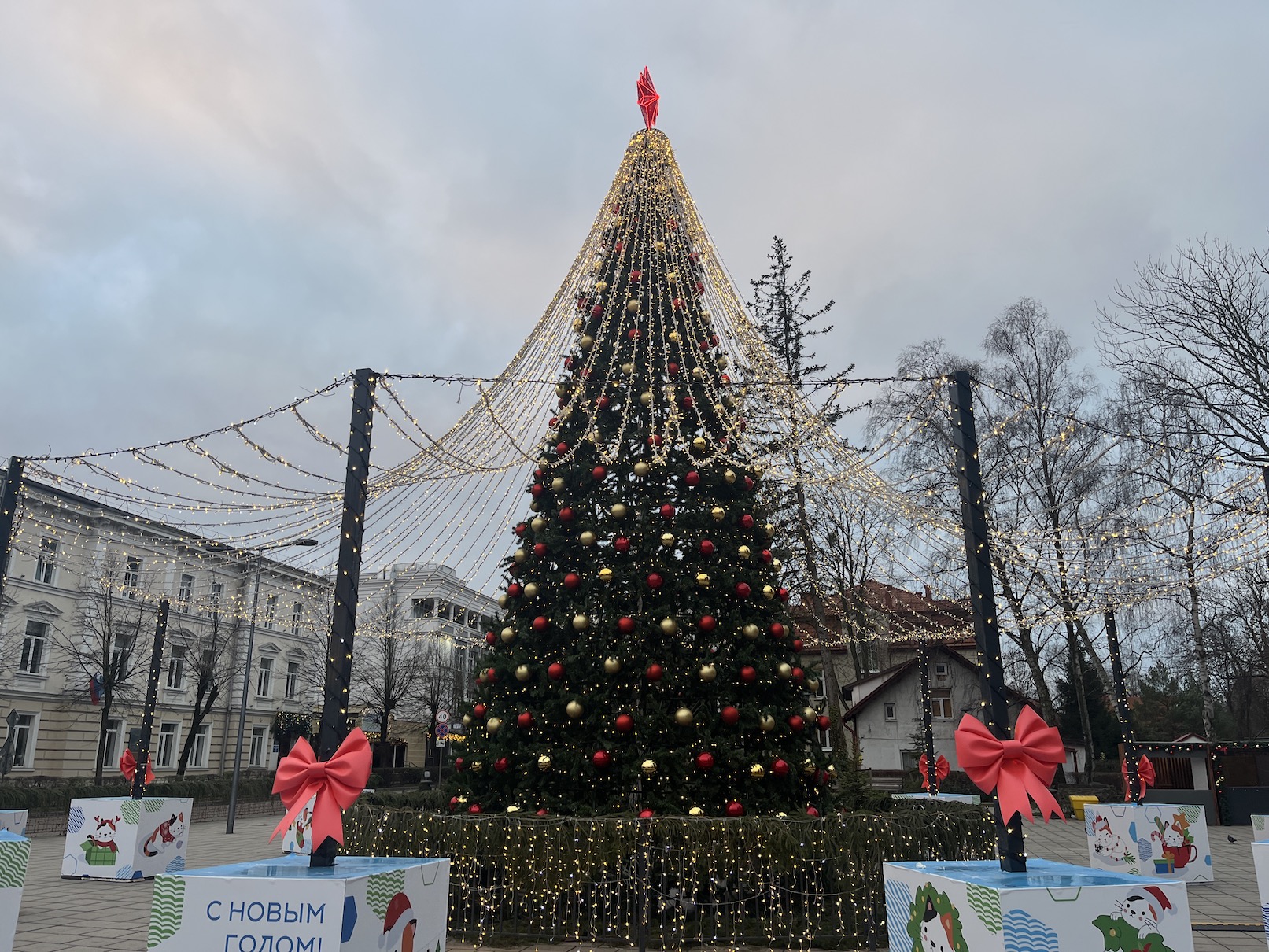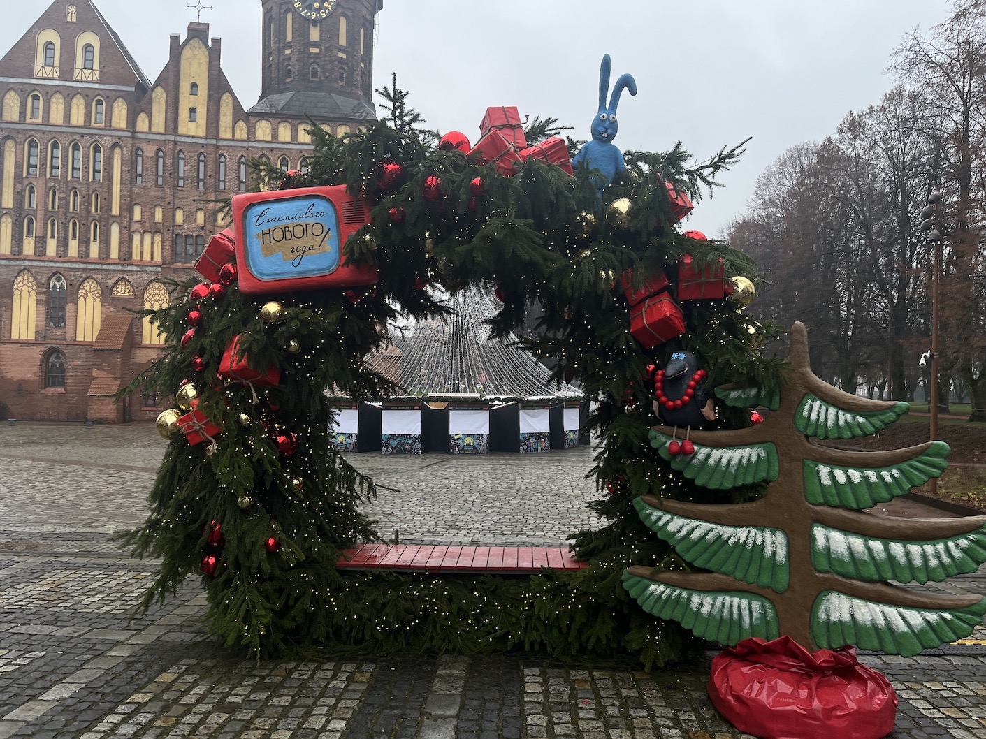 У Кафедрального собора стоит наряженная ёлка, увитая сверкающей гирляндой и вырезанными «нотами» — отсылка к концертам, которые проводят здесь регулярно. Даже в новогоднюю ночь в соборе будет звучать музыка, как и 1 января, и почти каждый день на праздниках. Чуть поодаль разместилась праздничная фотозона с еловой аркой и фигуркой вороны на дереве.