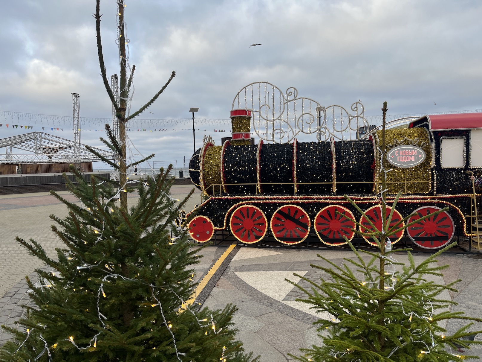У набережной на площади «Роза Ветров» стоит сверкающий новогодний экспресс в окружении живых елей.