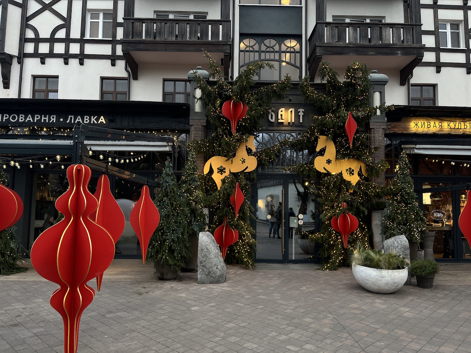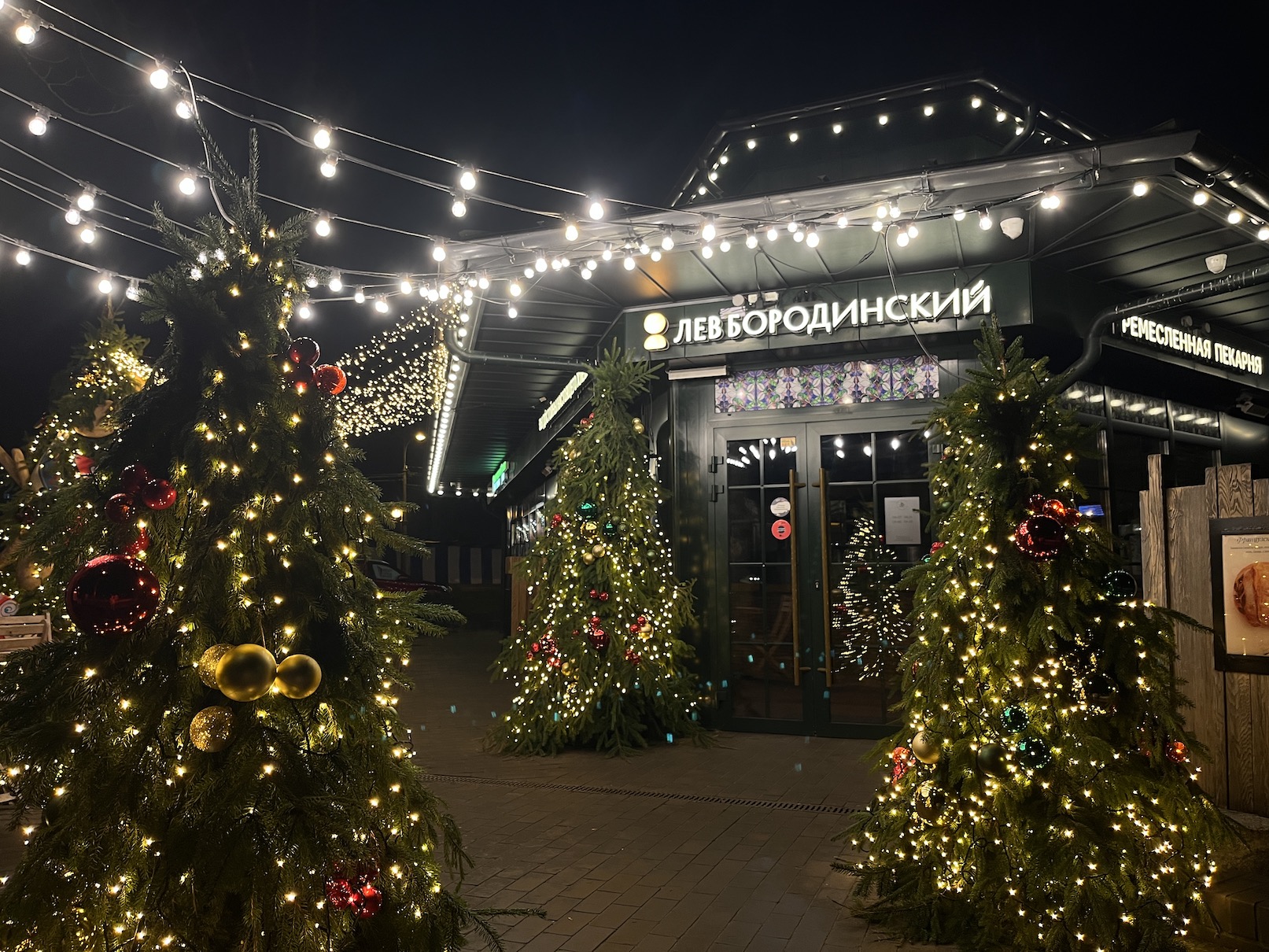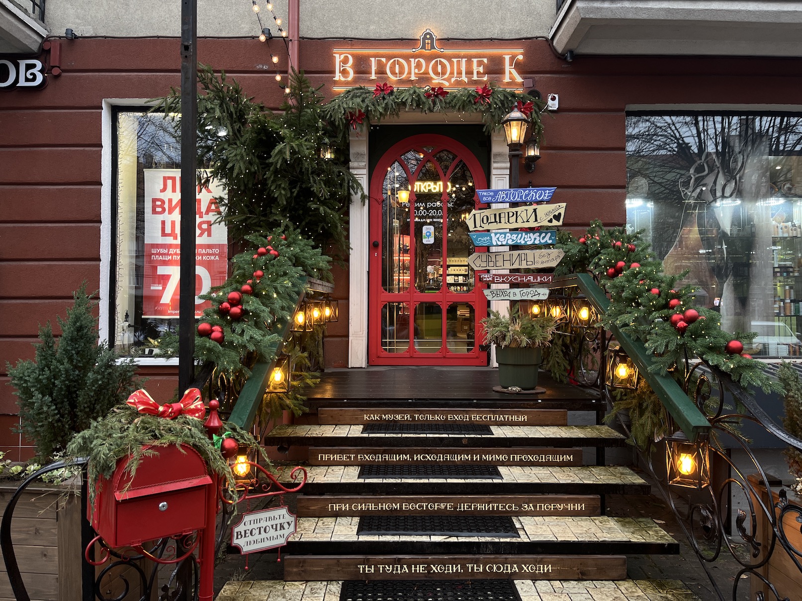 Вход в магазин декорирован хвойной аркой с алыми бантами и шарами, фонарями с тёплым светом и переливающимися огнями гирлянды.