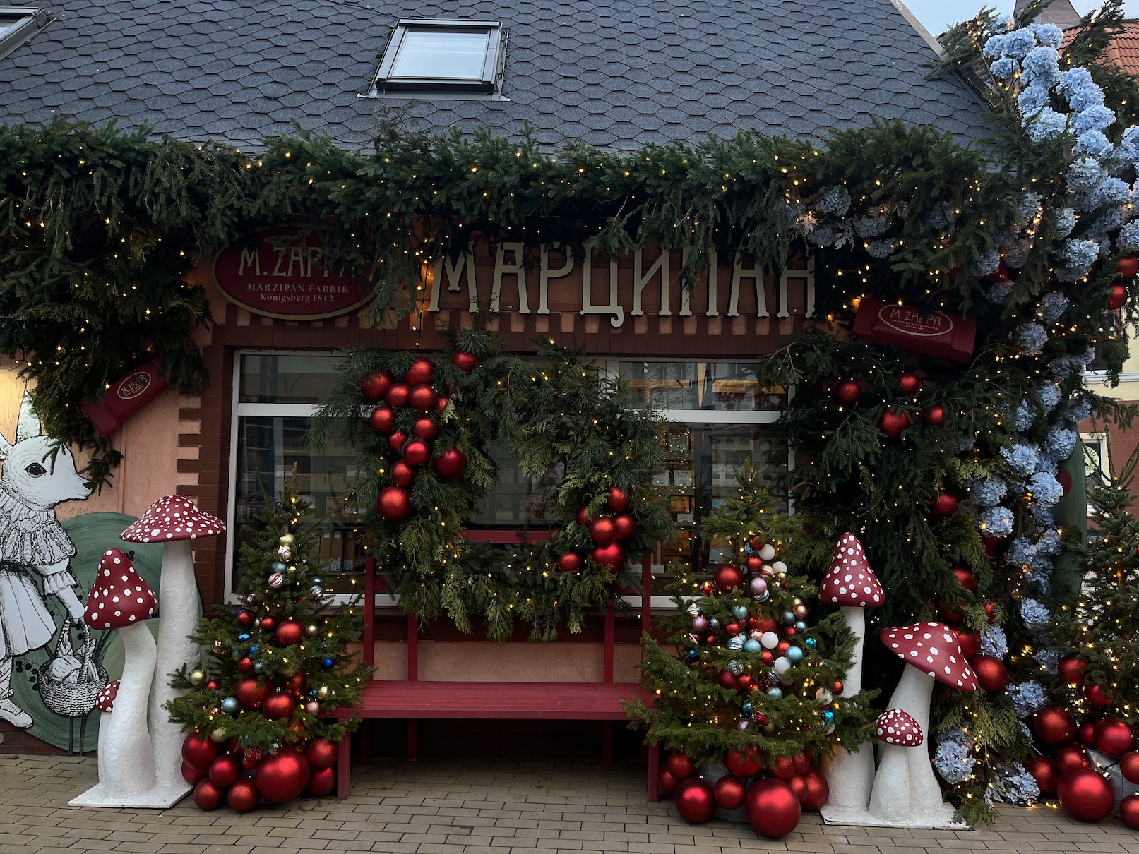 У магазина M.Zappa на Володарского, 2а праздничные декорации очень атмосферные — заведение украшено пышной зеленью, ёлочными игрушками и мухоморами с красной шляпкой.