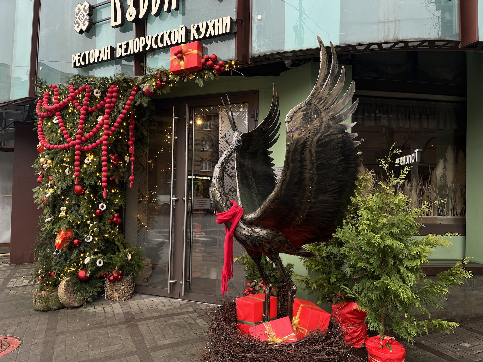 Вход оформлен свежей зеленью, красной гирляндой и шарами золотистых и бордовых оттенков. Рядом возвышается фигура аиста, в гнезде которого спрятаны подарки для грядущего праздника.