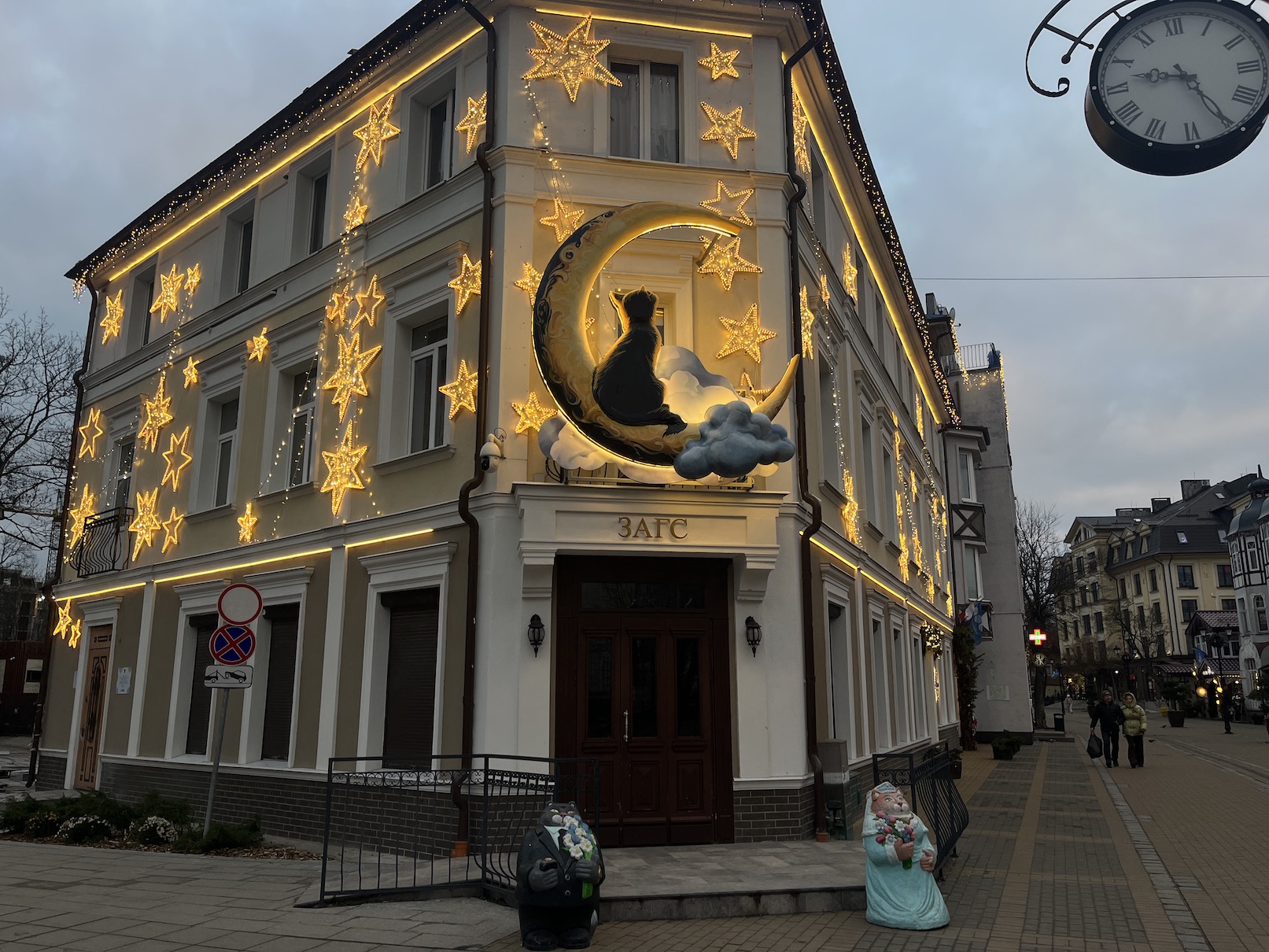 Ещё одно волшебное место — ЗАГС Зеленоградского муниципального района, усыпанный светящимися звездами и дополненный инсталляцией с мечтательной кошкой на месяце. А напротив — городская Новогодняя ёлка, украшенная золотыми и красными игрушками.