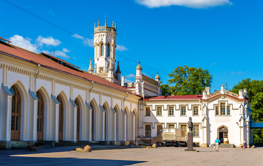 Плюсы: это один из самых дешёвых способов добраться до места (билет на поезд — 65 ₽ + билет на автобус, стоимостью 70 ₽). Кроме того, вы сможете увидеть первую неоготическую достопримечательность пригорода — станционное здание Нового Петергофа; эту роскошную башню с колоннадой и изящными лоджиями спроектировал архитектор Николай Бенуа в середине XIX века специально по заказу мецената Александра фон Штиглица, любящего вкладываться в строительство железных дорог.