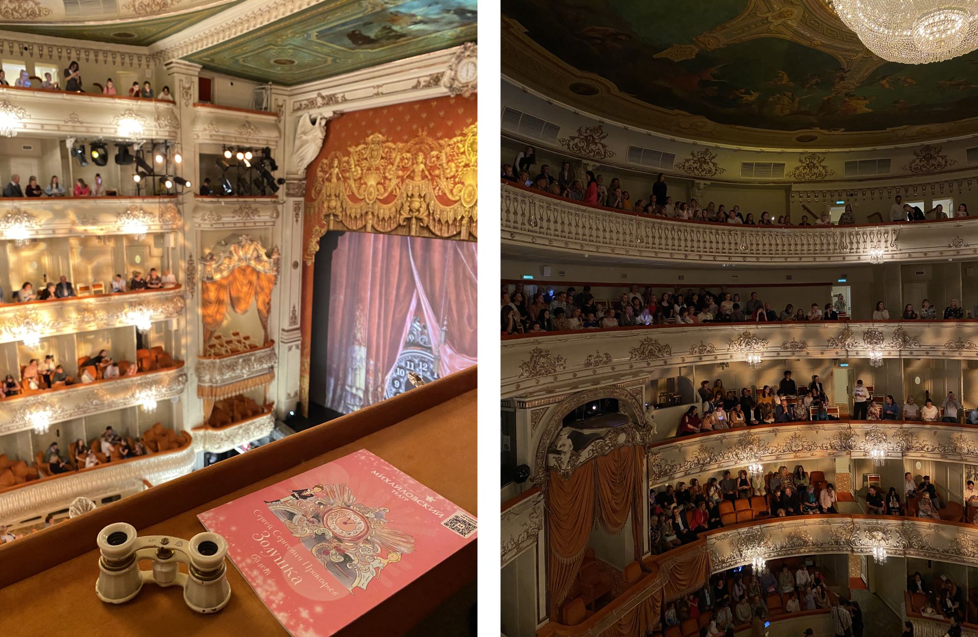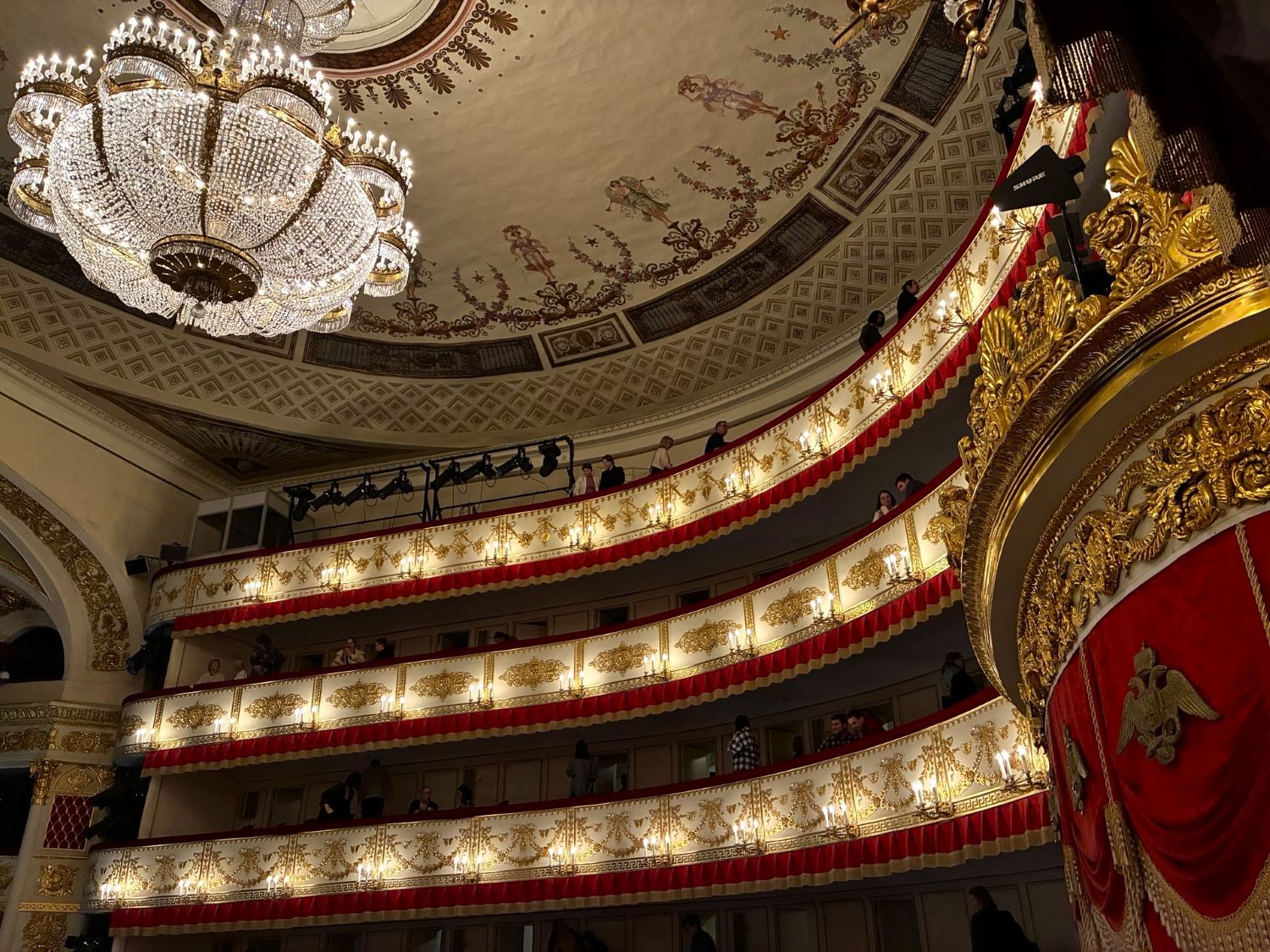 Ещё не советуем брать места на первом ярусе и на балконе рядом с царской ложей на основной сцене. Её венчает золотая корона, которая загораживает обзор.
