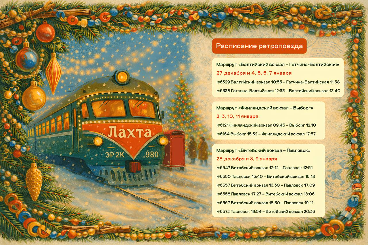Первый рейс запустят 27 декабря. Поезд отправится с Балтийского вокзала в 10:55 и прибудет в Гатчину в 11:58. Для его пассажиров проведут новогоднюю программу. В составе электрички будет экскурсионный вагон с гидом и Дедом Морозом. Праздничную атмосферу создаст музыка и тематические украшения, а на память о поездке каждый получит приятные сувениры.