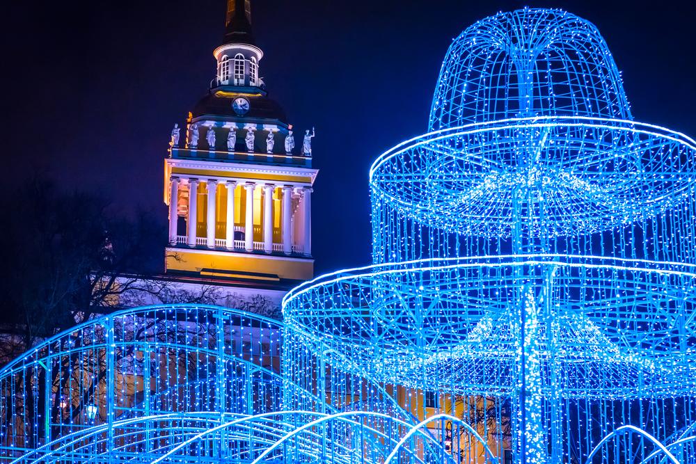Фонтан в сквере у Гостиного двора в Кронштадте. Светомузыкальное шоу проходит в 12.00, 16.00, 20.00 и 21.00 по будним дням; в 12.00, 14.00, 16.00, 19.00, 20.00 и 21.00 по выходным и праздничным дням.