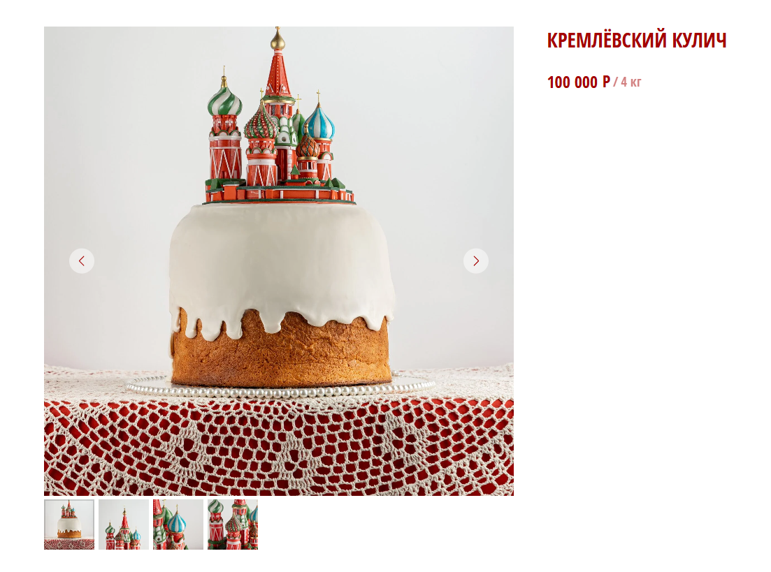 Кулич весит 4 килограмма. От классического пасхального десерта его отличает только миниатюрная копия собора Василия Блаженного, расположившаяся на верхушке. А вот что внутри изделия — загадка.