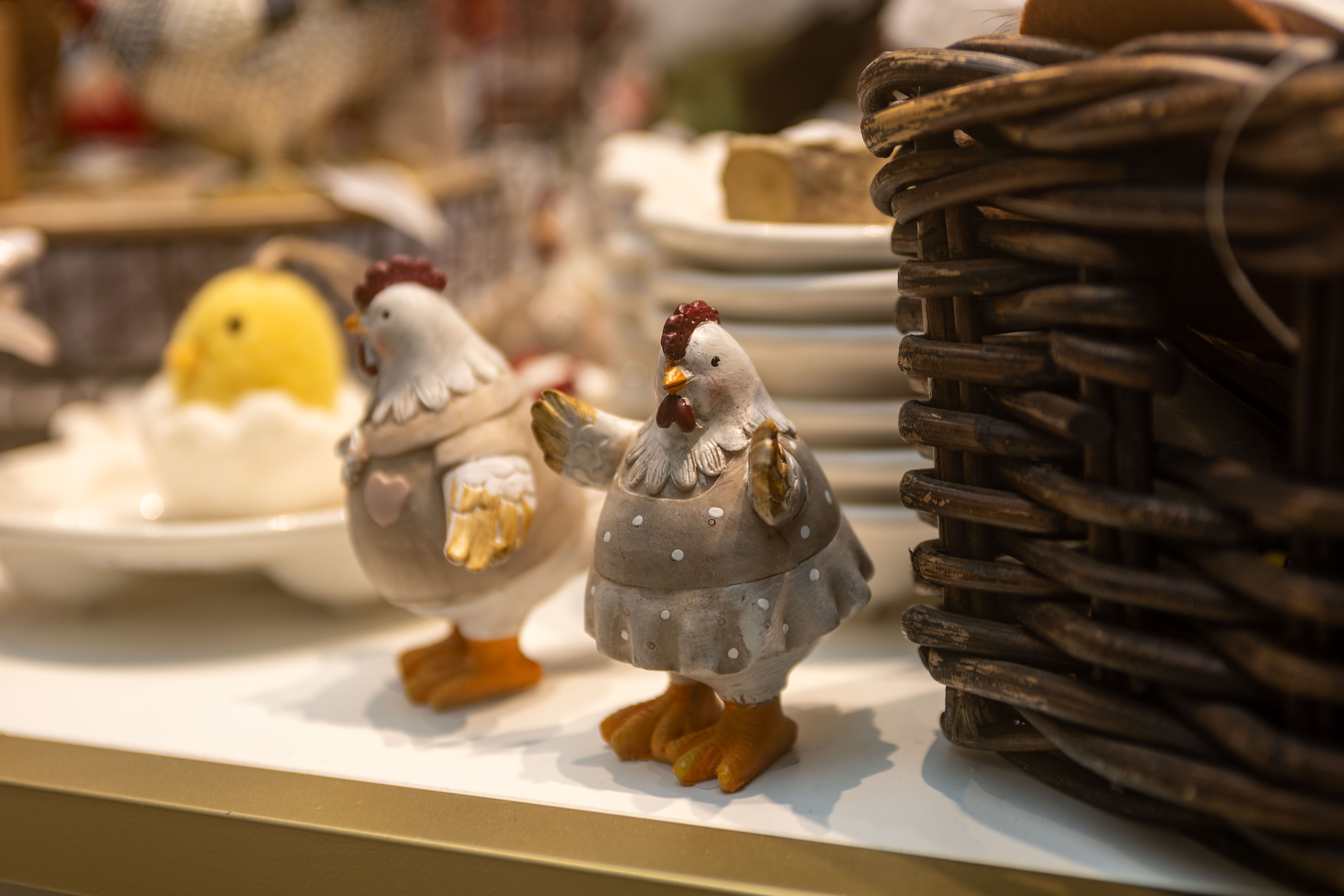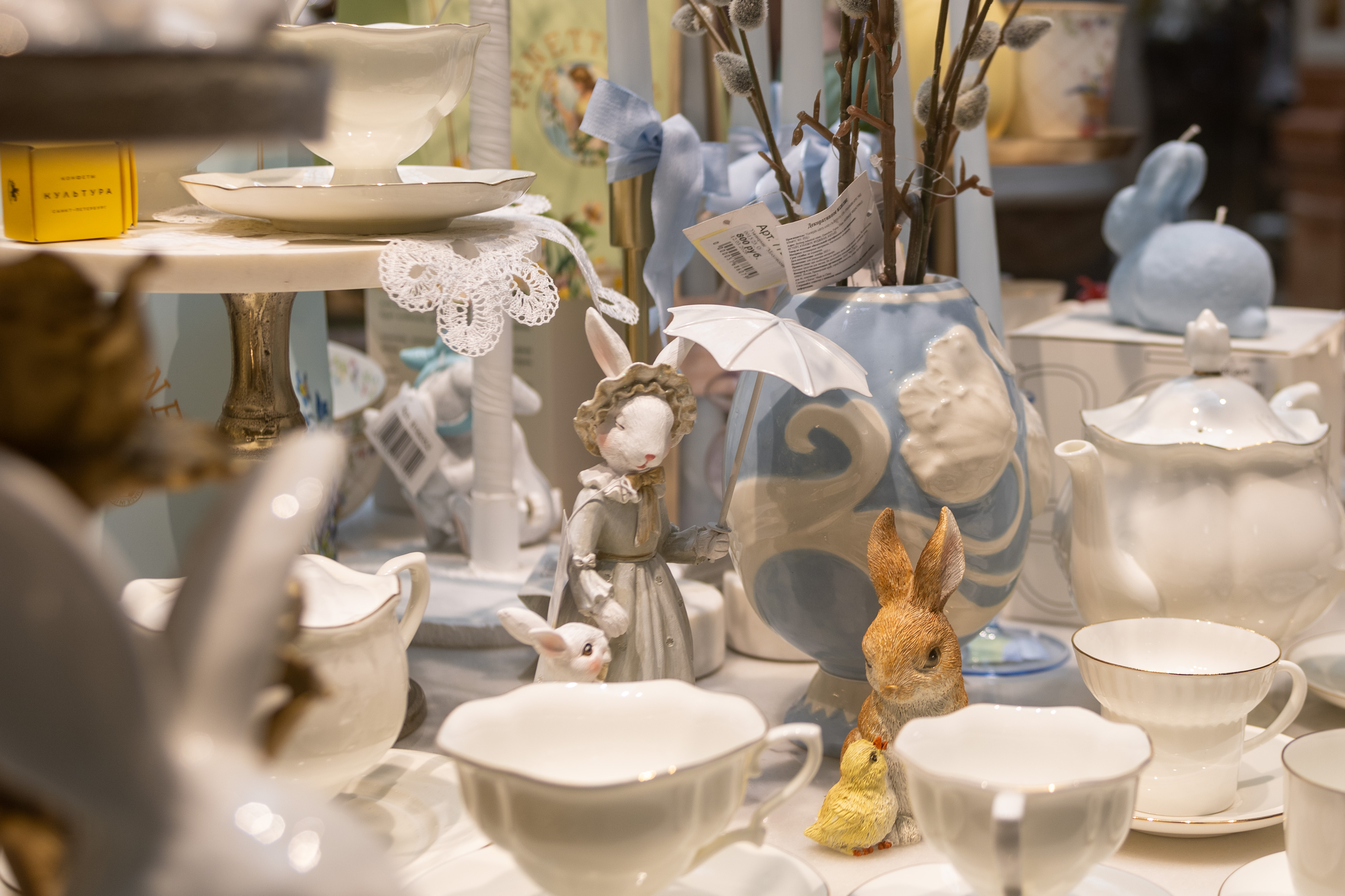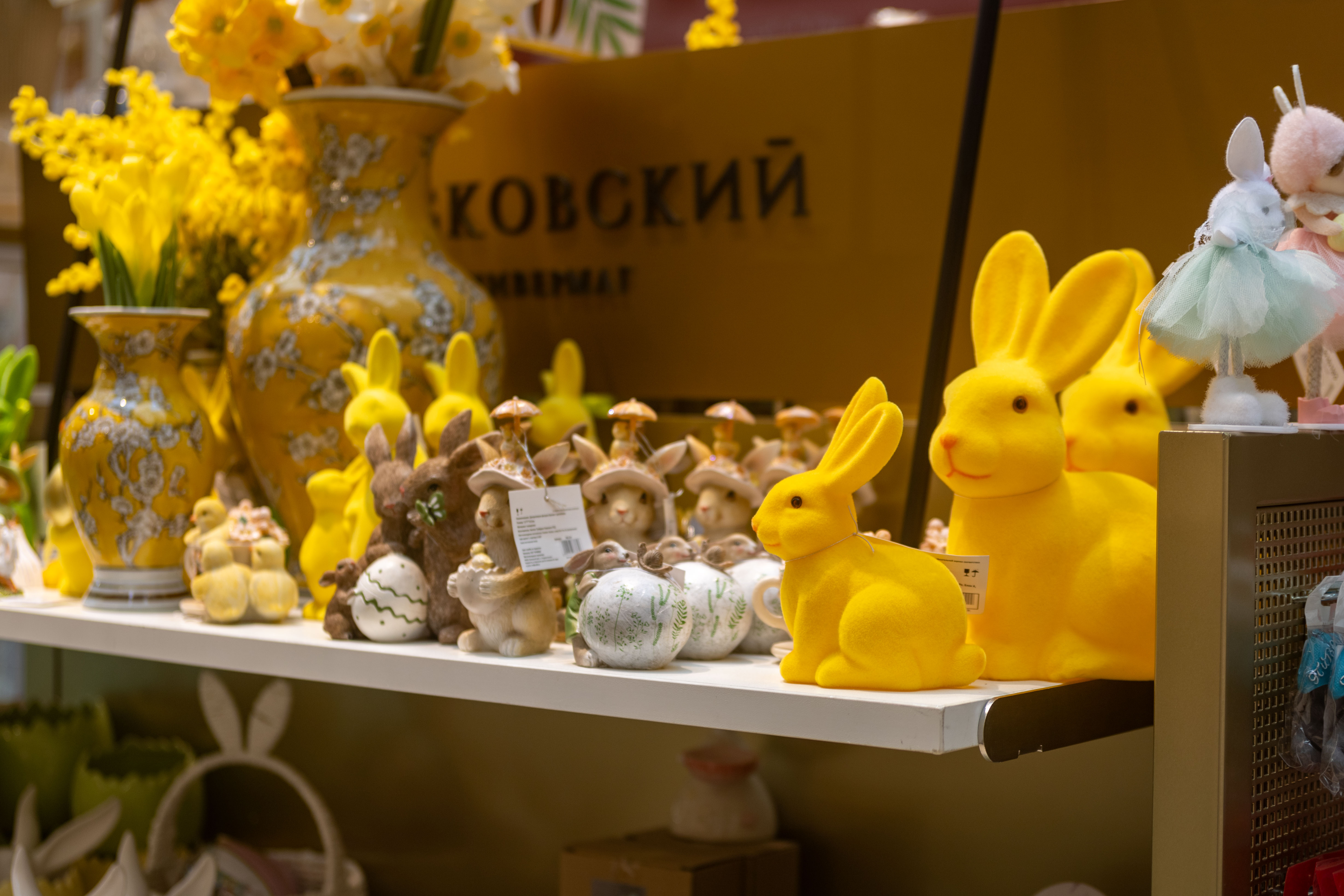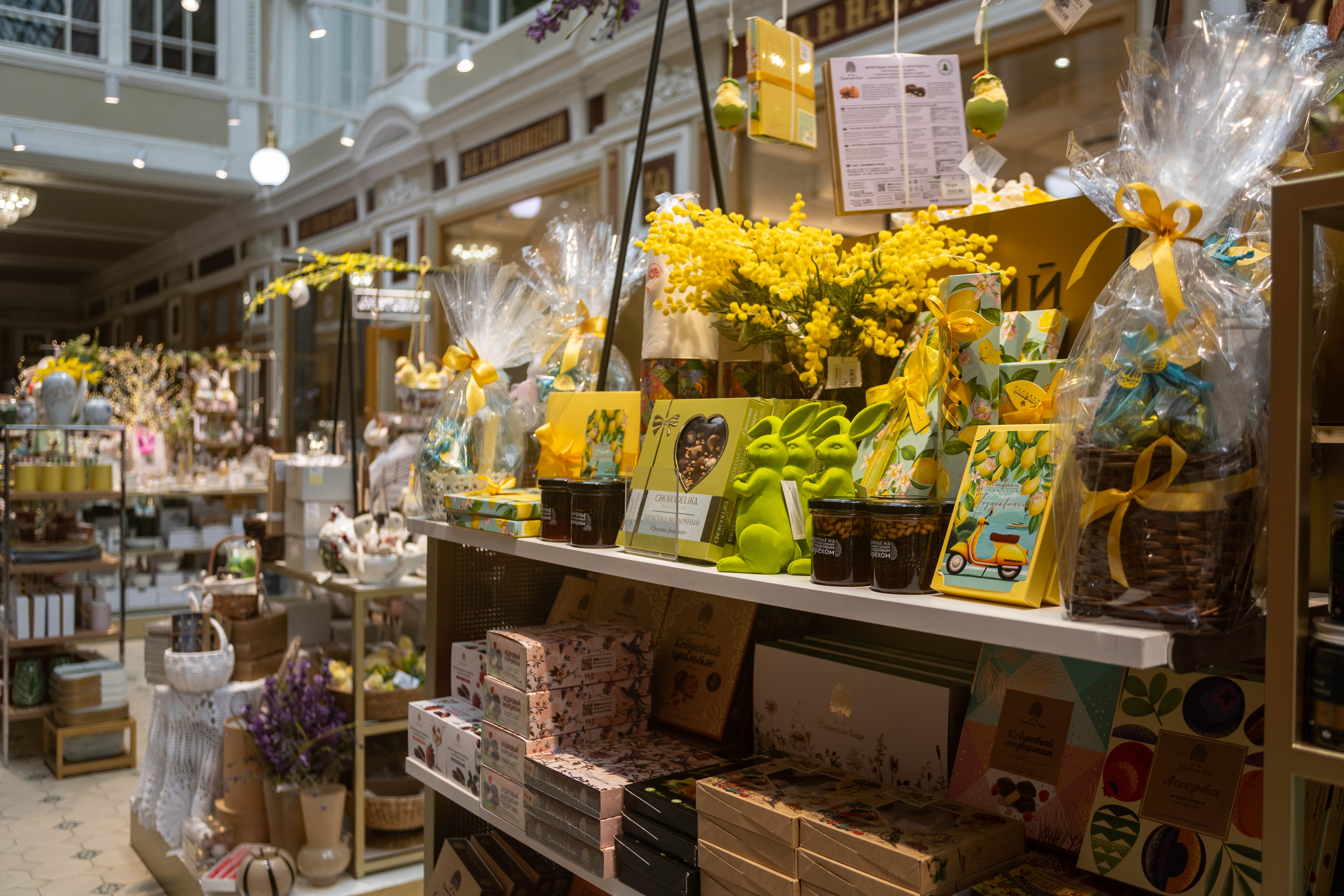Несколько стеллажей с декором расположились около магазинов №47-48. Здесь собрана изящная посуда для торжественного стола, мягкий текстиль, изысканные декоративные элементы, очаровательные венки, трогательные фигурки зайчиков и курочек и аппетитные подарочные сладости.