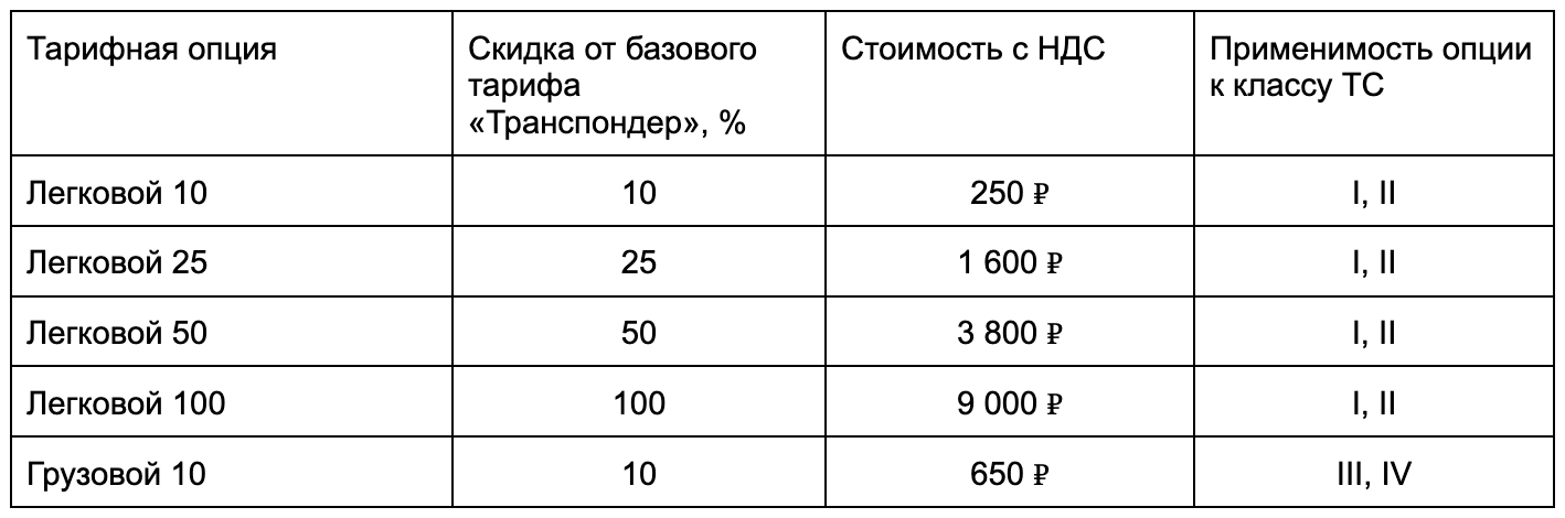 Тарифные опции для автомобилей с транспондером с 17 января будут такими: