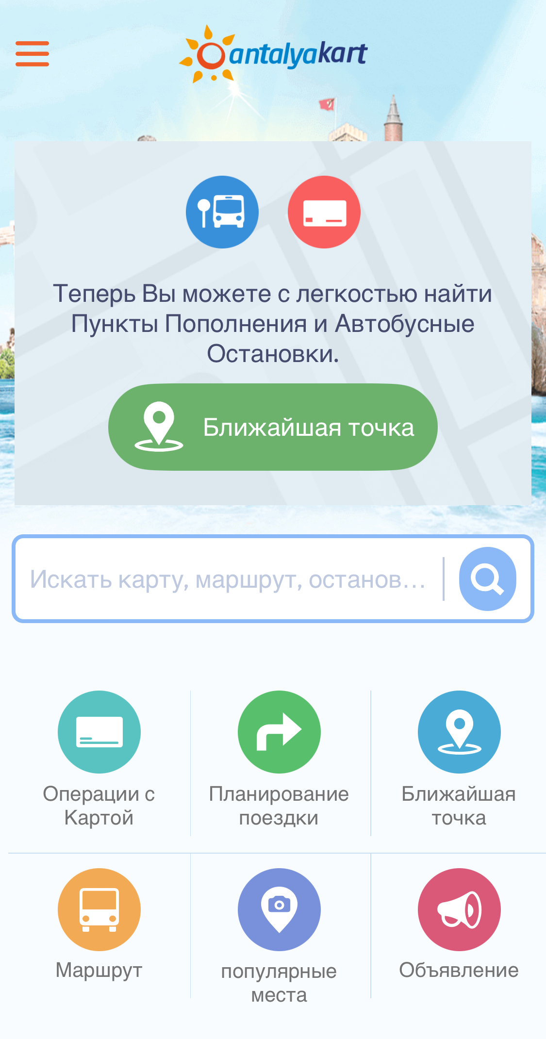 Для оплаты проезда в общественном транспорте понадобится универсальный проездной Антальякарт (Antalyakart). Его покупают в зоне парковки у выхода из Терминала 1 за 50 лир. Доехать до туда от Терминала 2 можно на бесплатном шаттле, пешком получится около 2,5 километров. Ещё купить или пополнить карту можно в автоматах на больших остановках или супермаркетах.