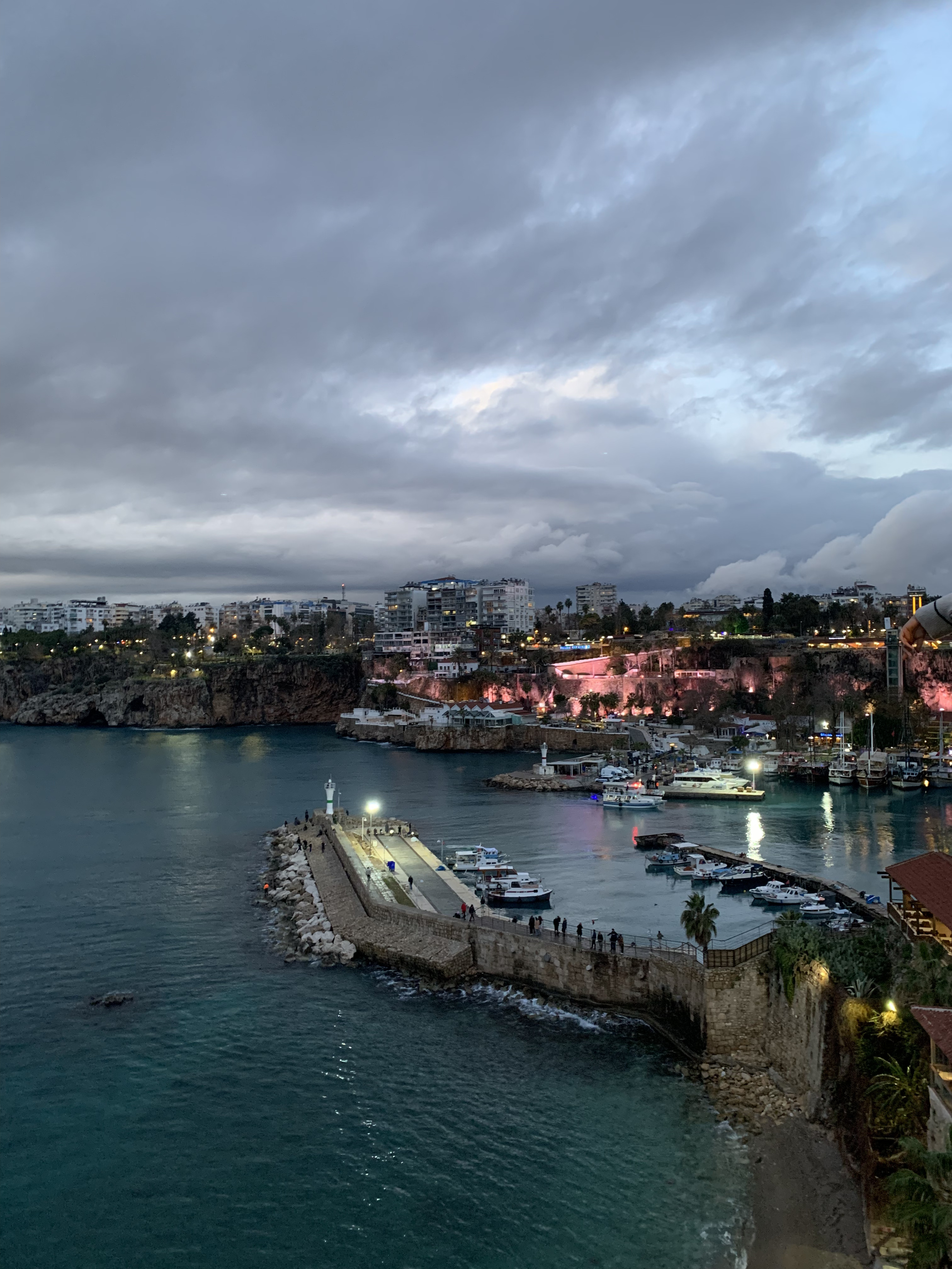 Исторический порт Антальи — уютная действующая гавань под отвесной скальной стеной с пирсом.