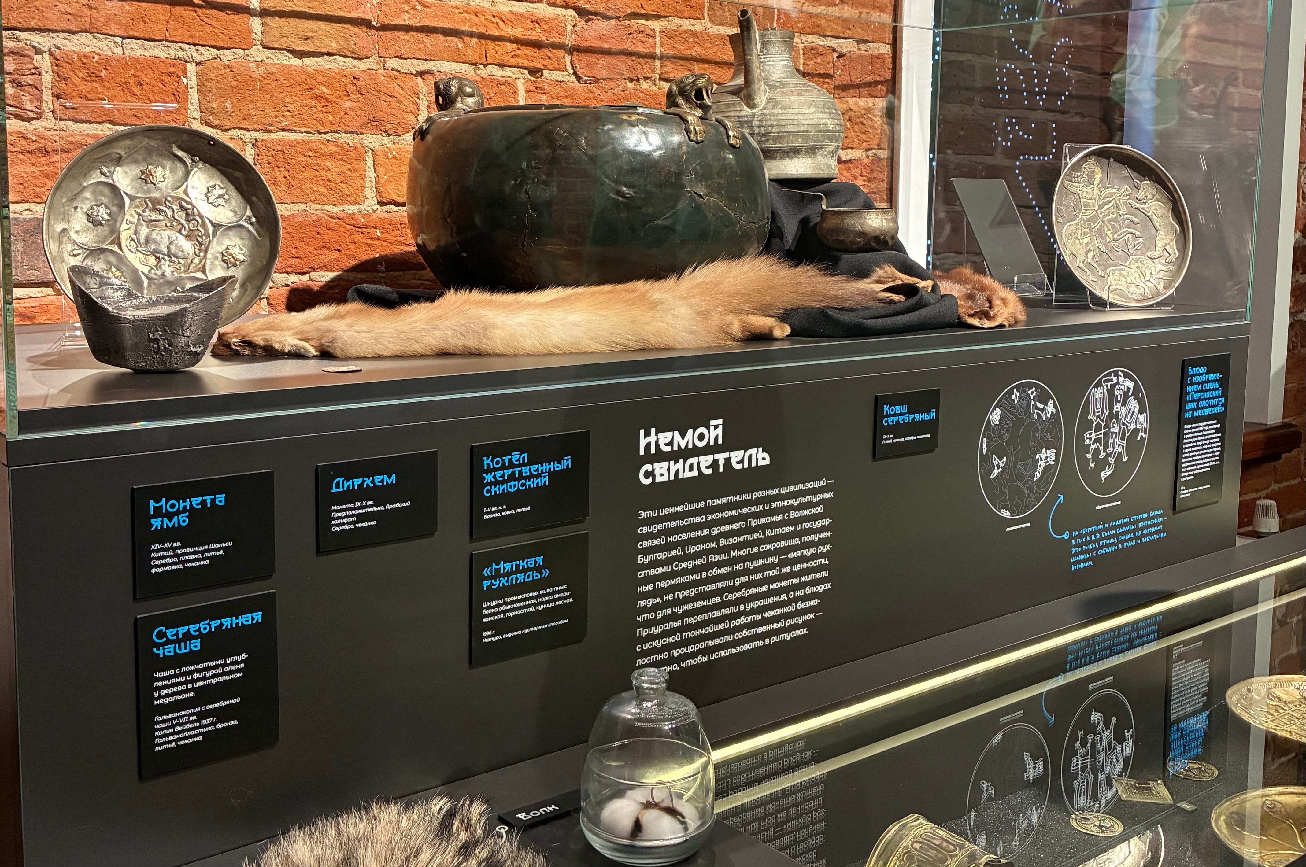 Мы успели посетить только эту экспозицию, но этого было достаточно — настолько подробным и понятным получился рассказ. Увидели окаменелости, разобрались в символике звериного стиля, посмотрели на чучела животных.