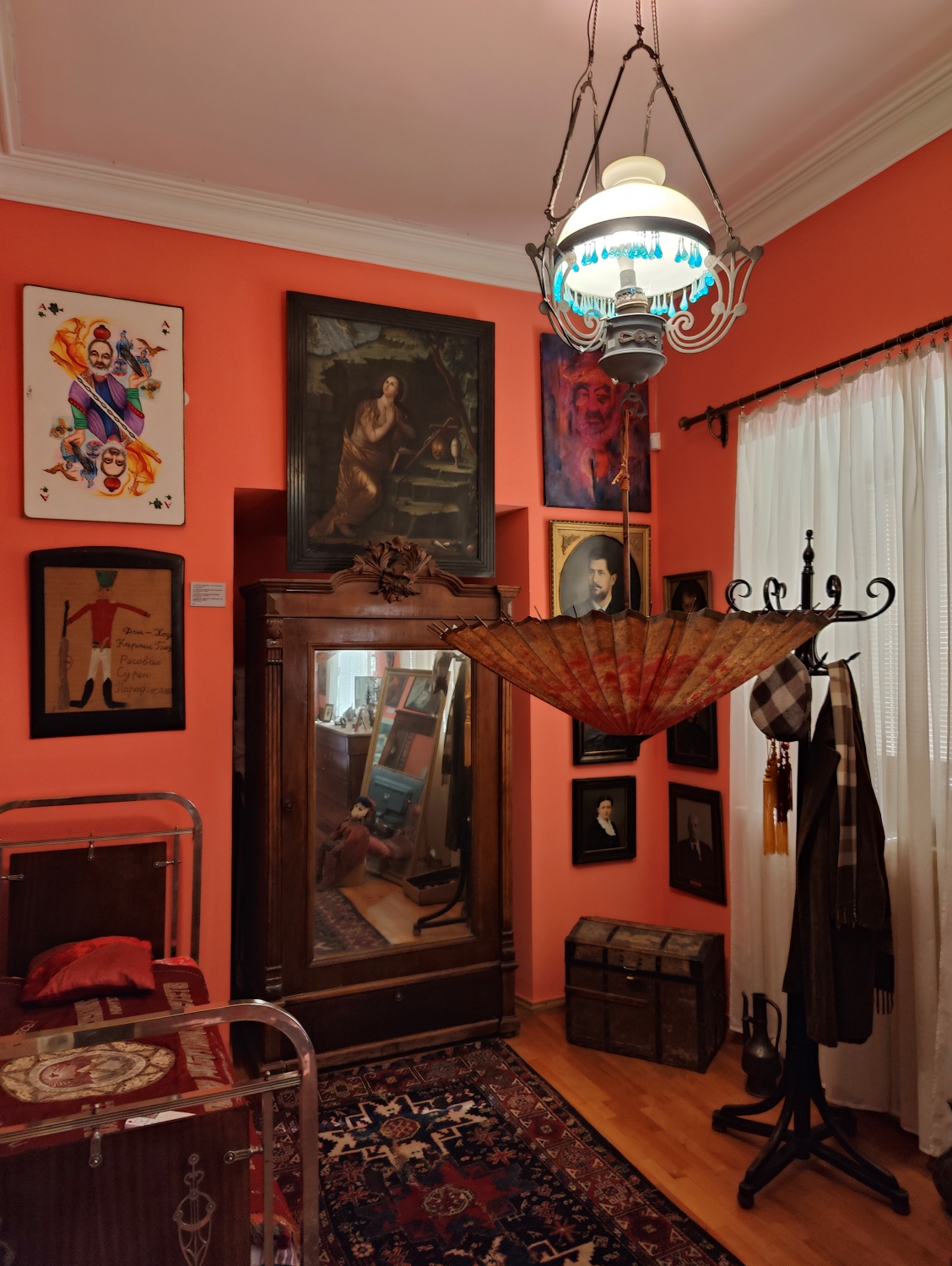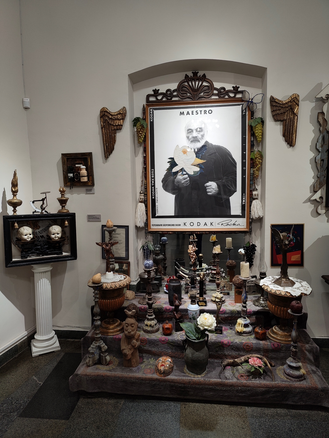 Дом хранит мир гениального режиссёра. Здесь нет строгой музейной логики, больше похоже на актуализацию магической вселенной Параджанова: коллажи, костюмы, куклы, картины, личные вещи. Атмосфера абсолютно уникальная и ради этого опыта стоит посетить дом режиссера или почти очутиться в его голове.