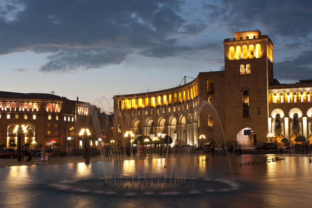 Площадь Республики — сердце столицы с архитектурным ансамблем из розового туфа.