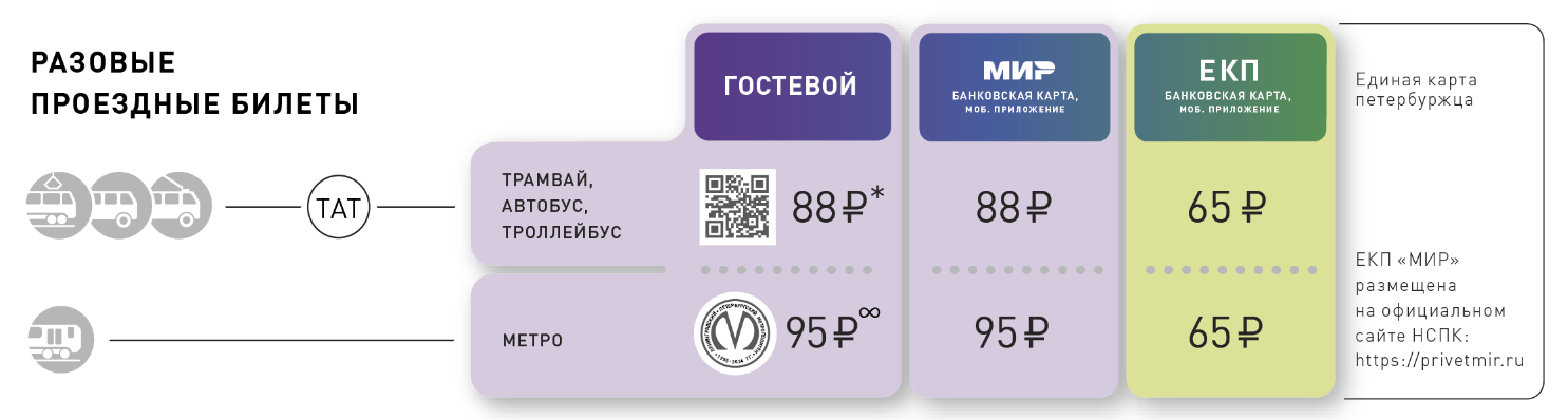 Для тех, кто планирует провести в Петербурге несколько дней, есть единые билеты на ограниченное количество суток. С их помощью можно оплатить проезд как в метрополитене, так и в наземном транспорте. Одно условие: между пересадками в метро должно пройти не менее 20 минут. Стоимость проездного на сутки составит 364 ₽, на трое и пятеро — 701 ₽ и 1 240 ₽.