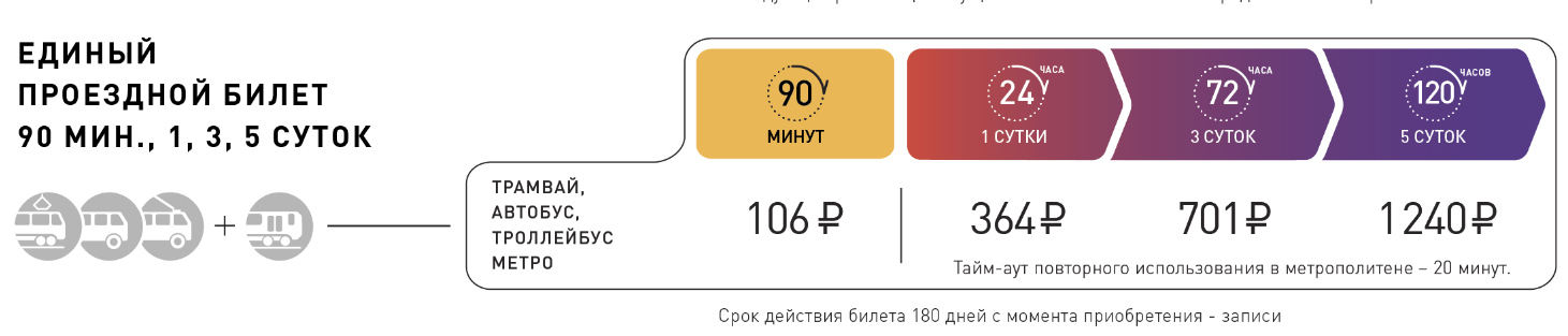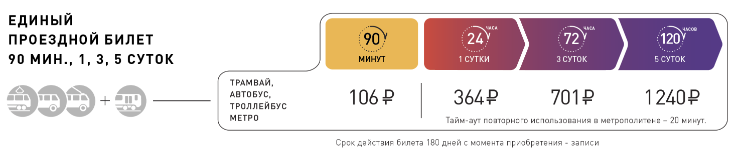Если собираетесь много ездить и делать пересадки между несколькими видами транспорта, лучше выбрать тариф «90 минут». Он позволит один раз прокатиться на метро и безлимитно пользоваться автобусами, троллейбусами и трамваями на протяжении полутора часов. С 1 января 2026 тариф «90 минут» стоит 106 ₽.