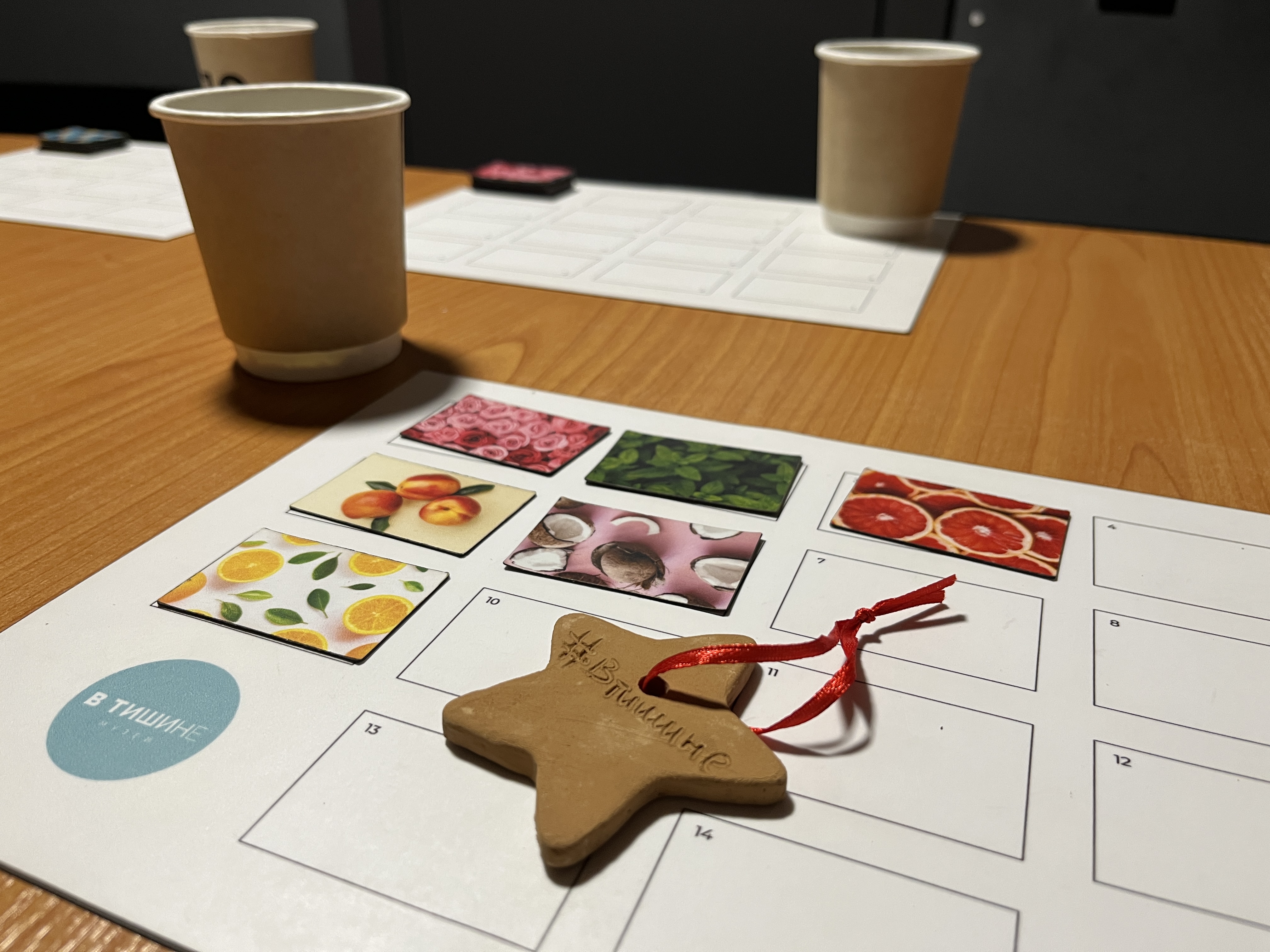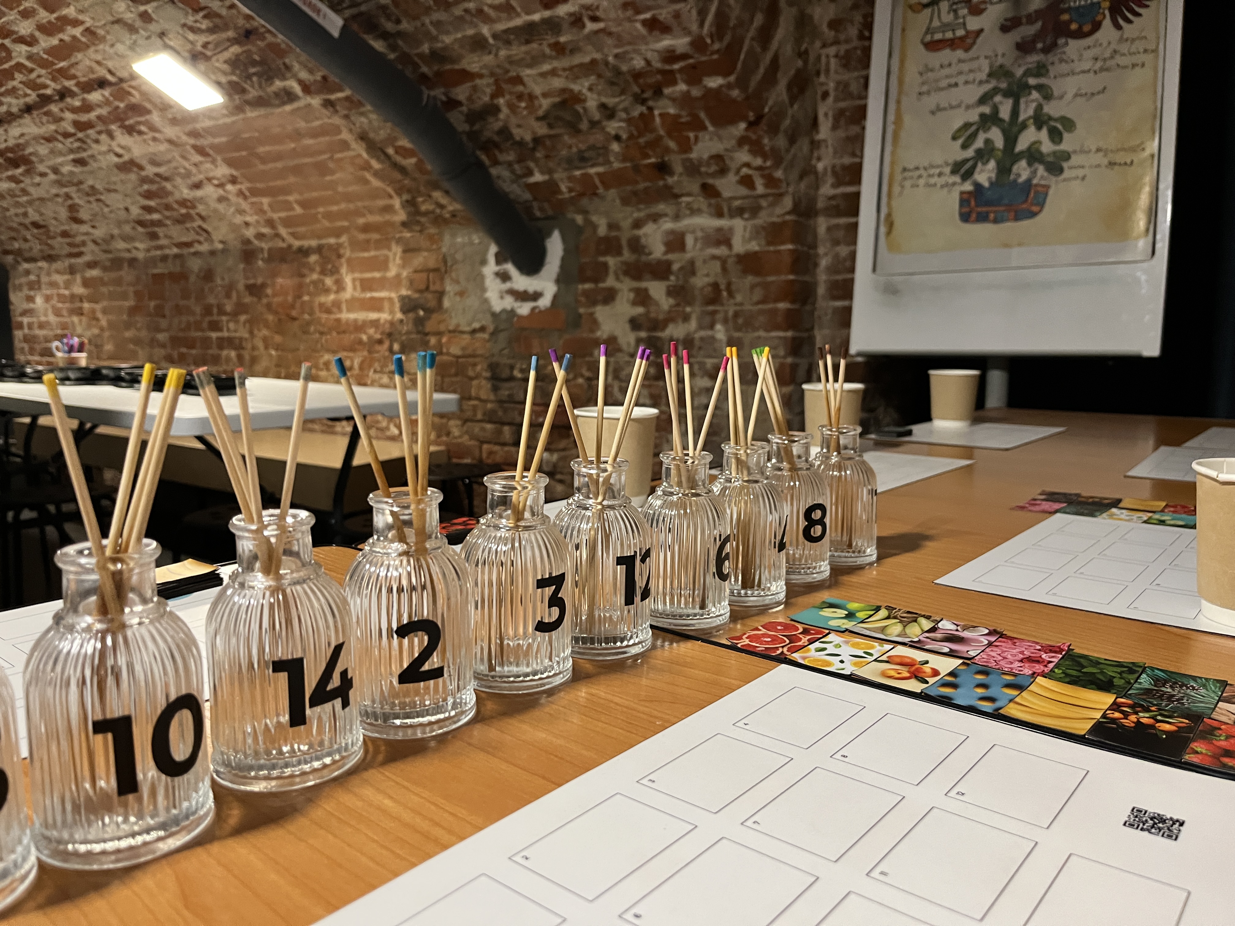 После основной части можно остаться на один или два мастер-класса. На первом подключают обоняние — с помощью игры «Арома-лото». Перед участниками выставляют 14 диффузоров с эфирными маслами, среди них «Апельсин», «Роза» и другие узнаваемые запахи. Задача — определить все ароматы и разложить их по карточкам. Те, кто справляется без единой ошибки, получают памятный значок.
