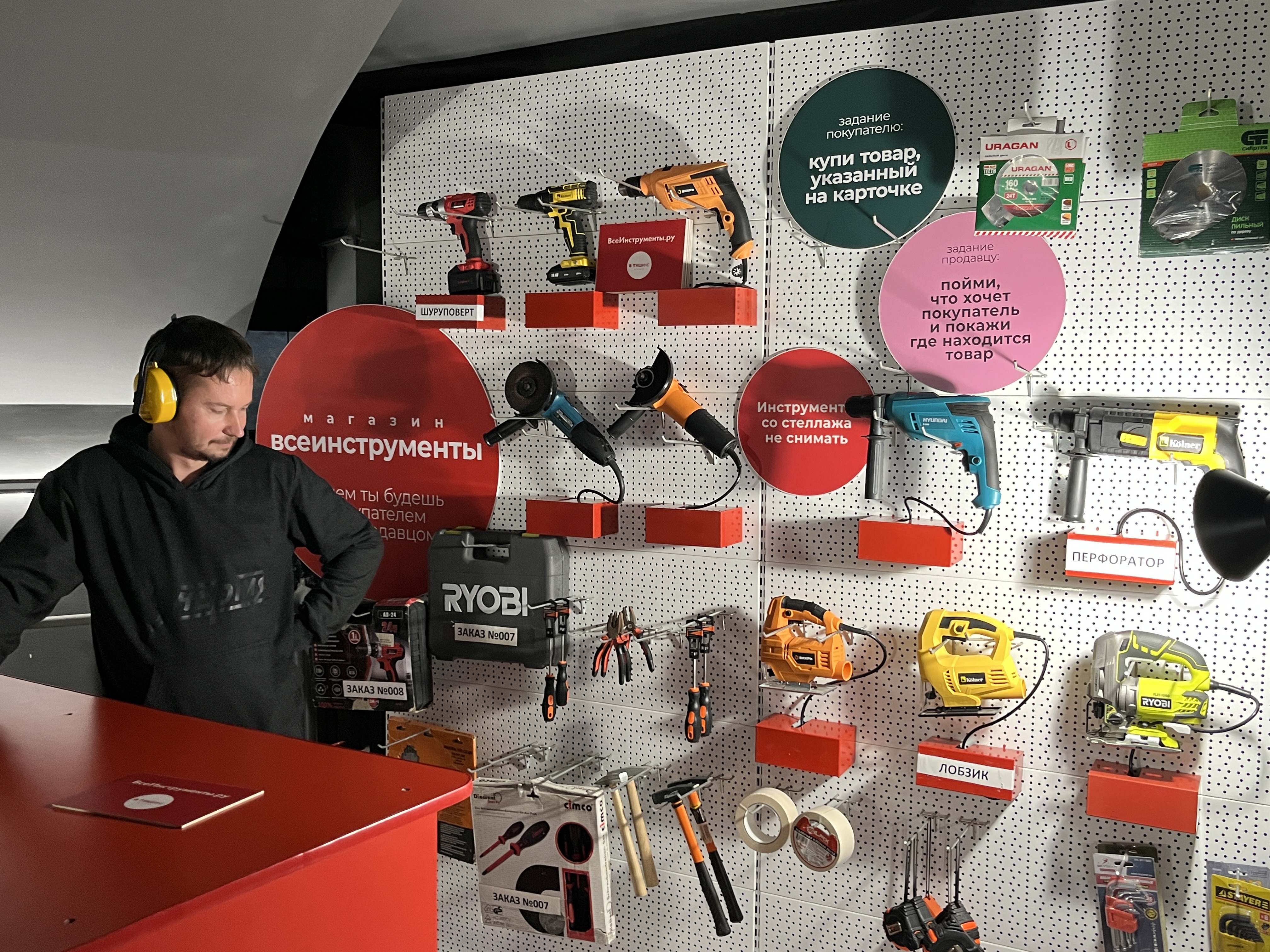 Во втором зале проходит ещё один интерактив. Гостям предлагают разыграть сцену из обычной жизни — поход в строительный магазин. Один участник играет покупателя, а другой — продавца. Задача простая только на первый взгляд: попробуй объясни без слов, что тебе нужен шуруповёрт, перфоратор или лобзик. В ход идет активная жестикуляция: люди рисуют в воздухе, показывают на воображаемые полки, а иногда просто разводят руками. Получается немного комично, но в этом и смысл — почуствовать, как трудно бывает донести простую мысль.