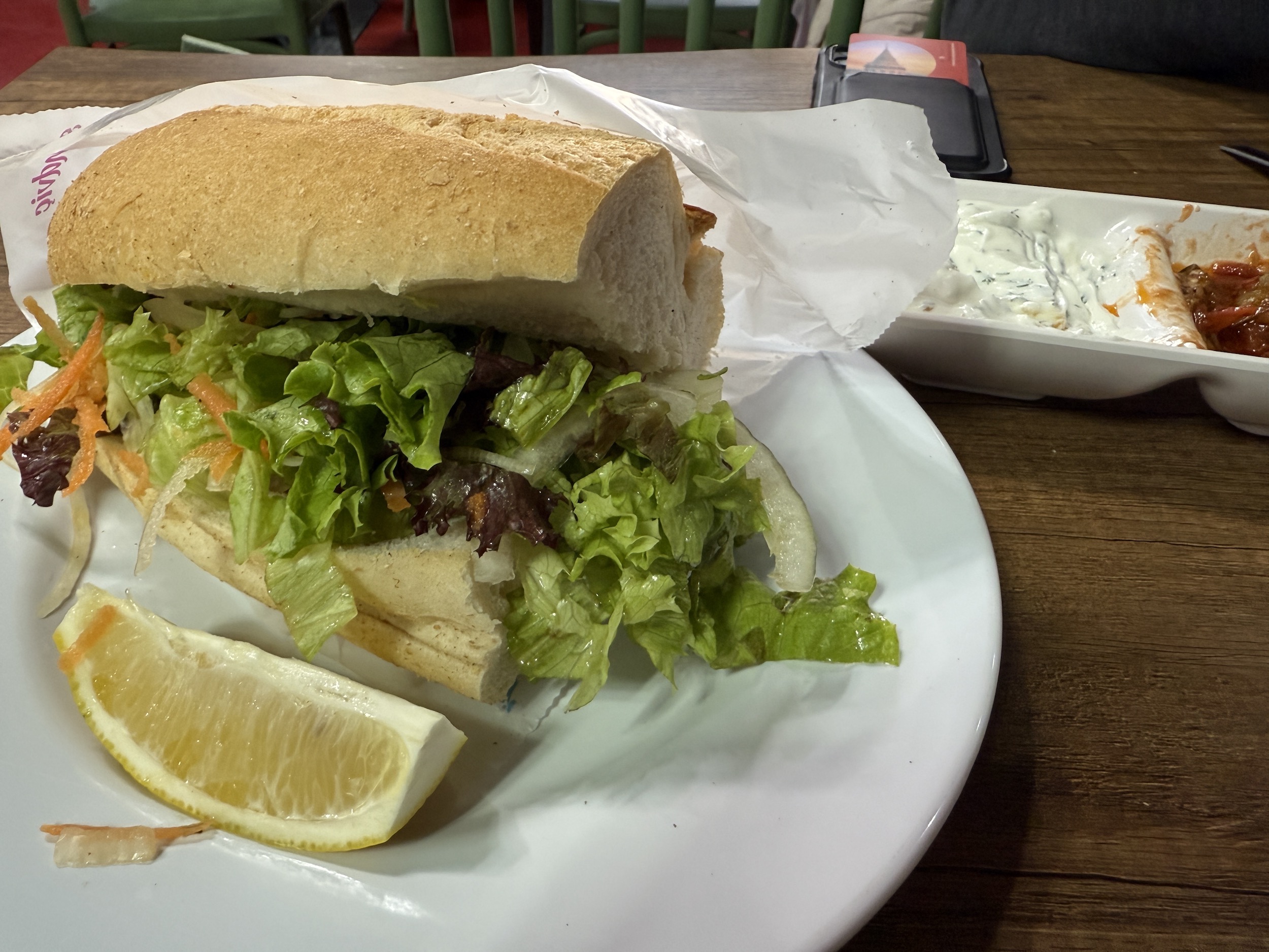 Советую взять похожее блюдо — «балык ролл». Суть та же, но вместо хлеба рыба завёрнута в поджаренный лаваш, за счёт чего её вкус ощущается ярче, не перебиваясь хлебом. Обязательно сбрызните всё это лимоном, и наслаждайтесь. Цена за такой перекус начинается от 200 лир (380 ₽).