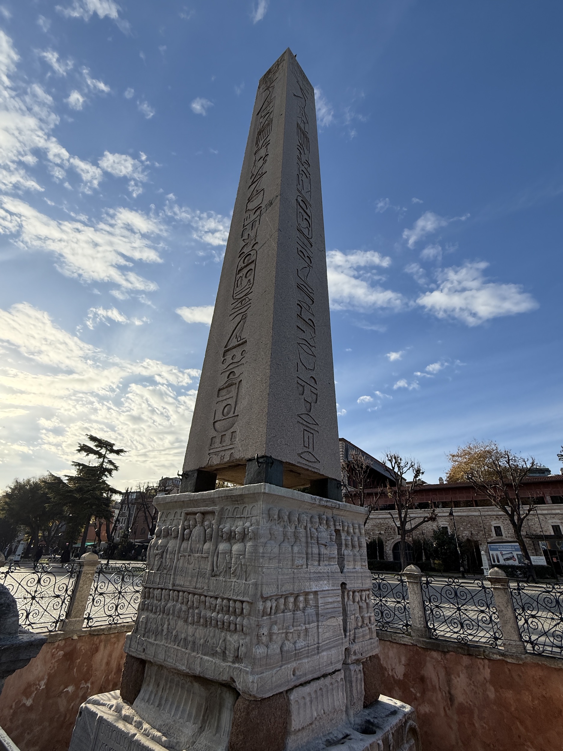 Египетский обелиск — это самый старый памятник Стамбула. Его создали в XVI веке до н. э. в Древнем Египте. Сперва его высота составляла 37 метров, но после транспортировки из Фив в Александрию, а затем в Константинополь, уцелело только 25 метров. Обелиск установили на мраморный постамент с барельефами, изображающими императора Феодосия I, который и привёз памятник в столицу Византии.